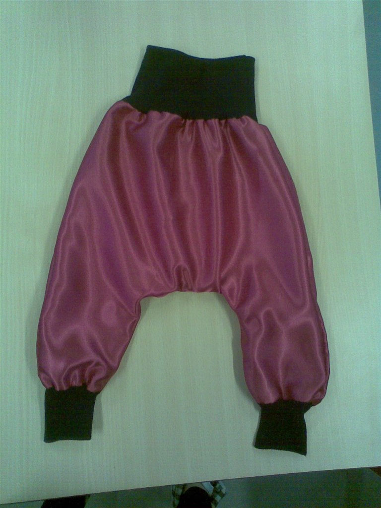 Pullemulle skriver: Nu vil jeg lige blære mig lidt. Jeg har nemlig syet et par baby-haremsbukser! Undskyld den dårlige kvalitet - bukserne er skrig-pink med mørkeblå elastisk ribkant