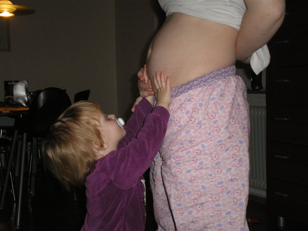 Når der skal tages mavebilleder herhjemme, løber Emma straks hen og stiller sig på samme måde ved min mave. Tænk hvis det kun var lillebror der blev fotograferet...hihi.