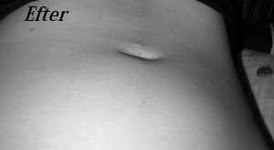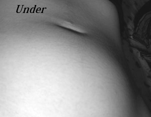 Jeg fangede det lige på foto i dag, det må da være plukveer, ikke? Det spænder og maven bliver hård og "buler op". Man kan se det på det første billede hvor der står "under", og det andet billede med "efter" er maven uden plukve. Ved godt det ikke er fra helt samme vinkel, men synes tydeligt man kan se på "under" billedet, at maven er blevet til sådan en hård kugle der buler op.. Ligger på ryggen på billederne.