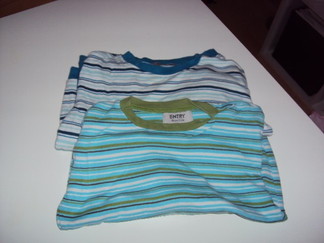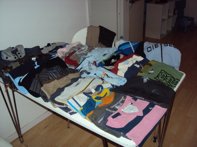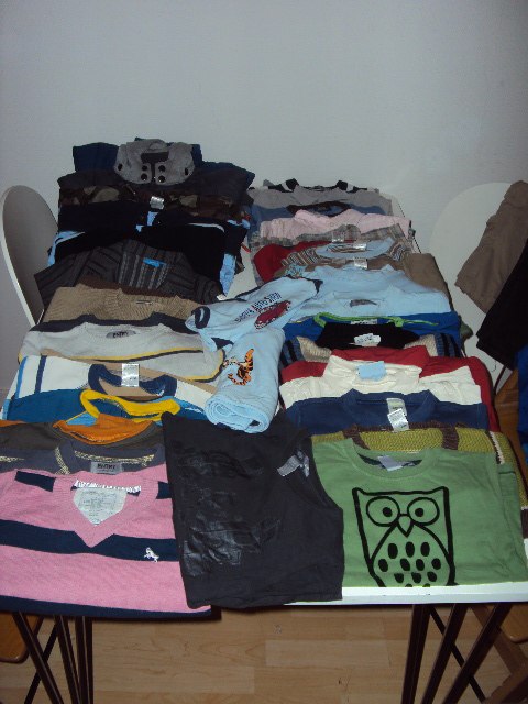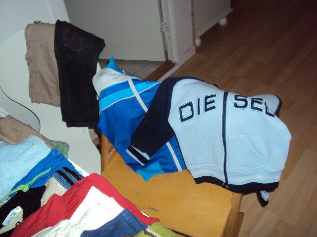 jeg kunne godt være interesseret i den lyserøde og marine stribede trøje der ligger forrest på billede 1+ den blå og hvide lynlåstrøje der hænger over stolen.