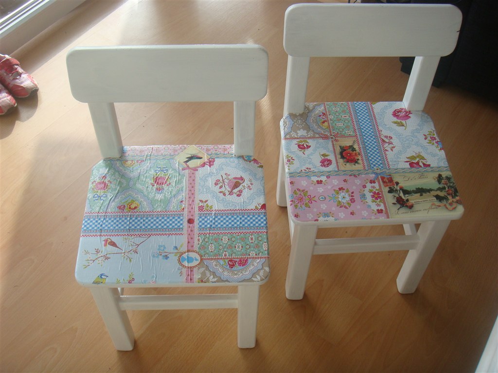 Har i dag lavet disse to, smukke børnestole. Hvidmelet med betræk (gevet overlak).275 kr. for begge to