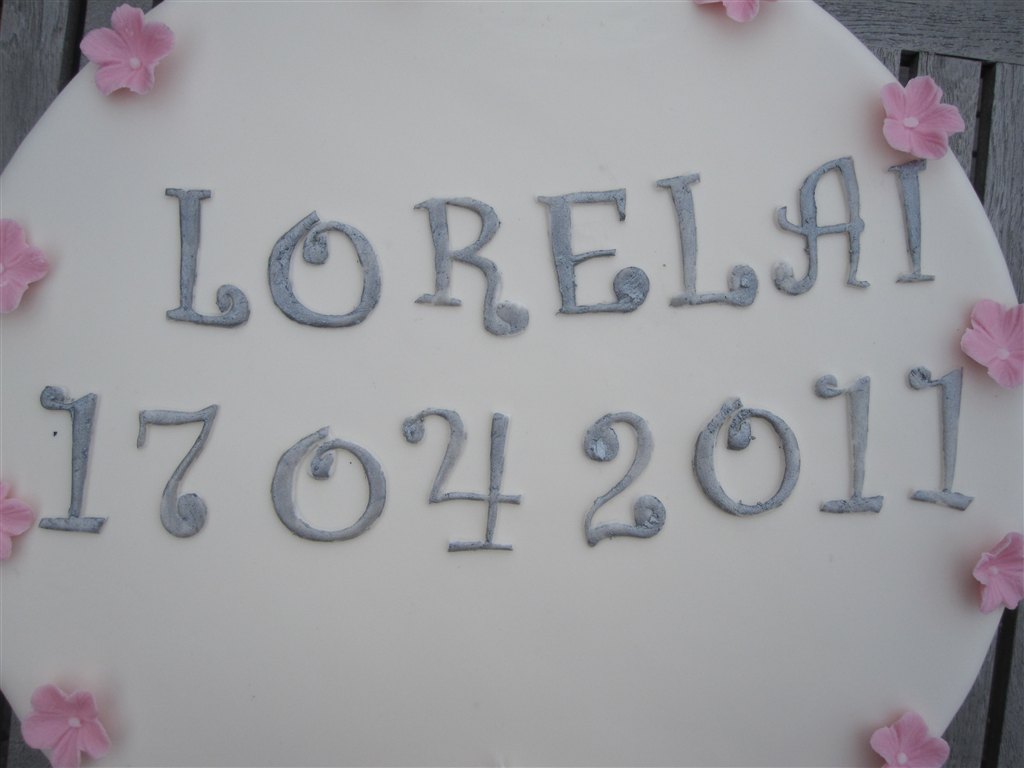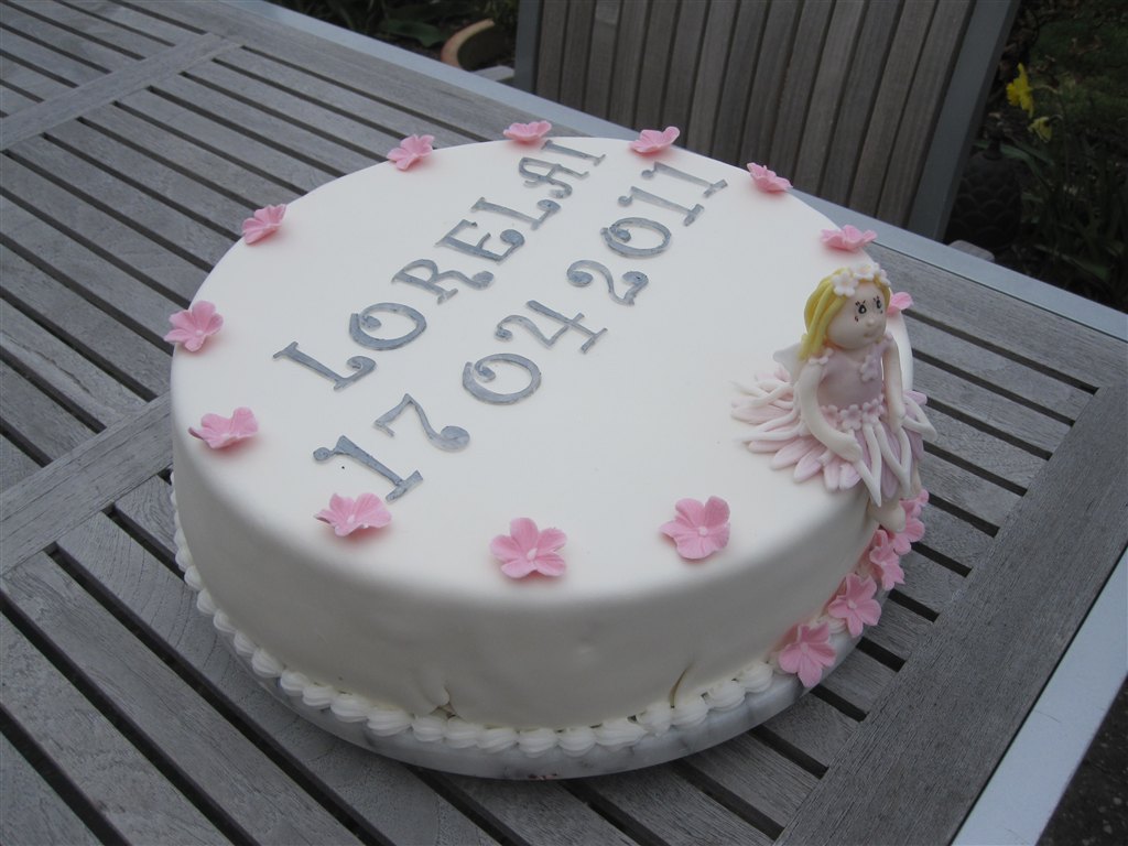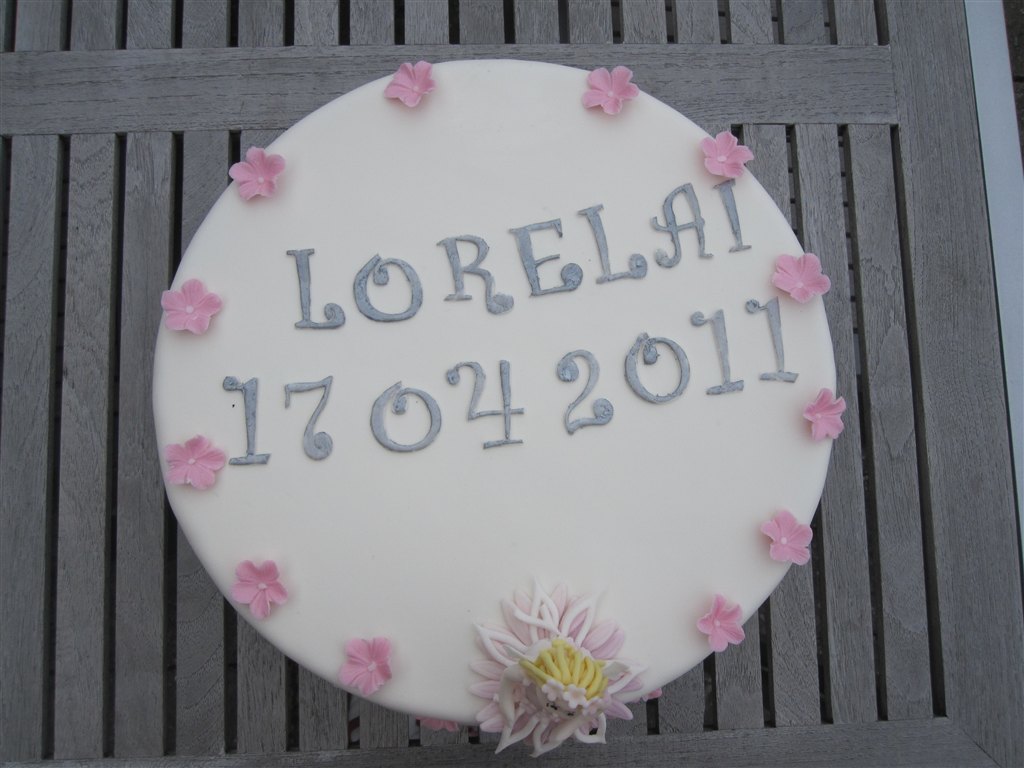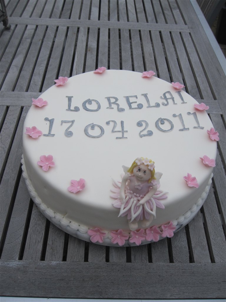 Så er Lorelai's dåbskage endelig færdig og afhentet. Og dermed er weekendens sidste kage overstået.. Phew.. Jeg syntes det var virkelig hårdt at skulle lave bare to kager på en weekenden, så hatten af for folk som Michelle (Polkaprik), der laver der 4-5 kager per weekenden.. Jeg ville dø!!