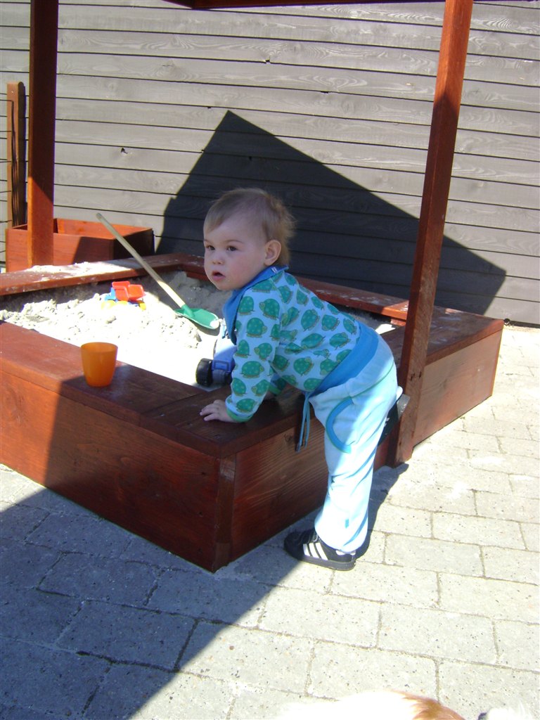 Han har fået ny sandkasse så han hygge sig ...
