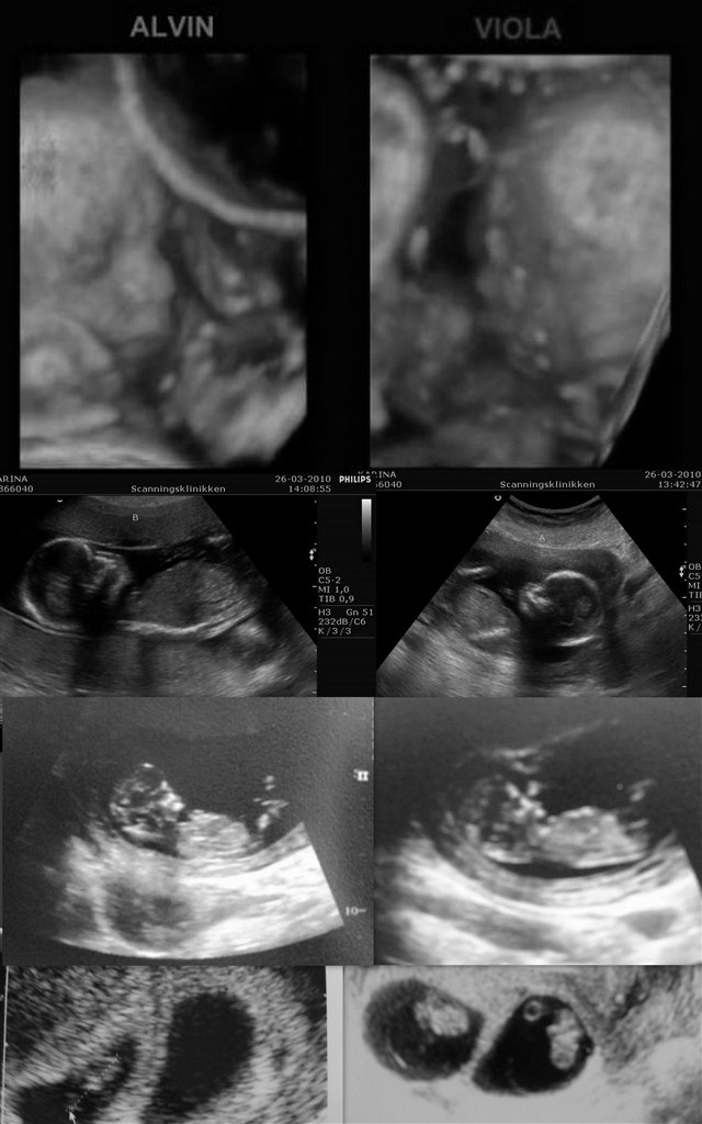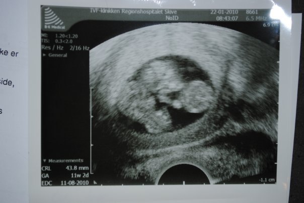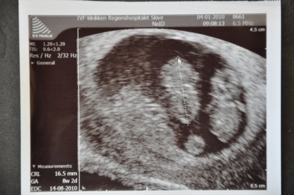 7+0 og man kan næsten ikke se den ene i sin sæk. Der var hjerteblink i begge. Lægen sagde, at han aldrig ville se efter hjerteblink før 7+0, da det bestemt ikke betød, at der ikke var liv, hvis man ikke kunne finde det.