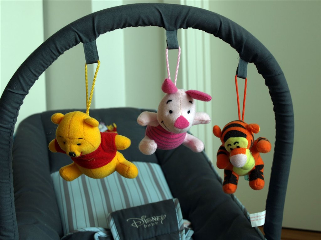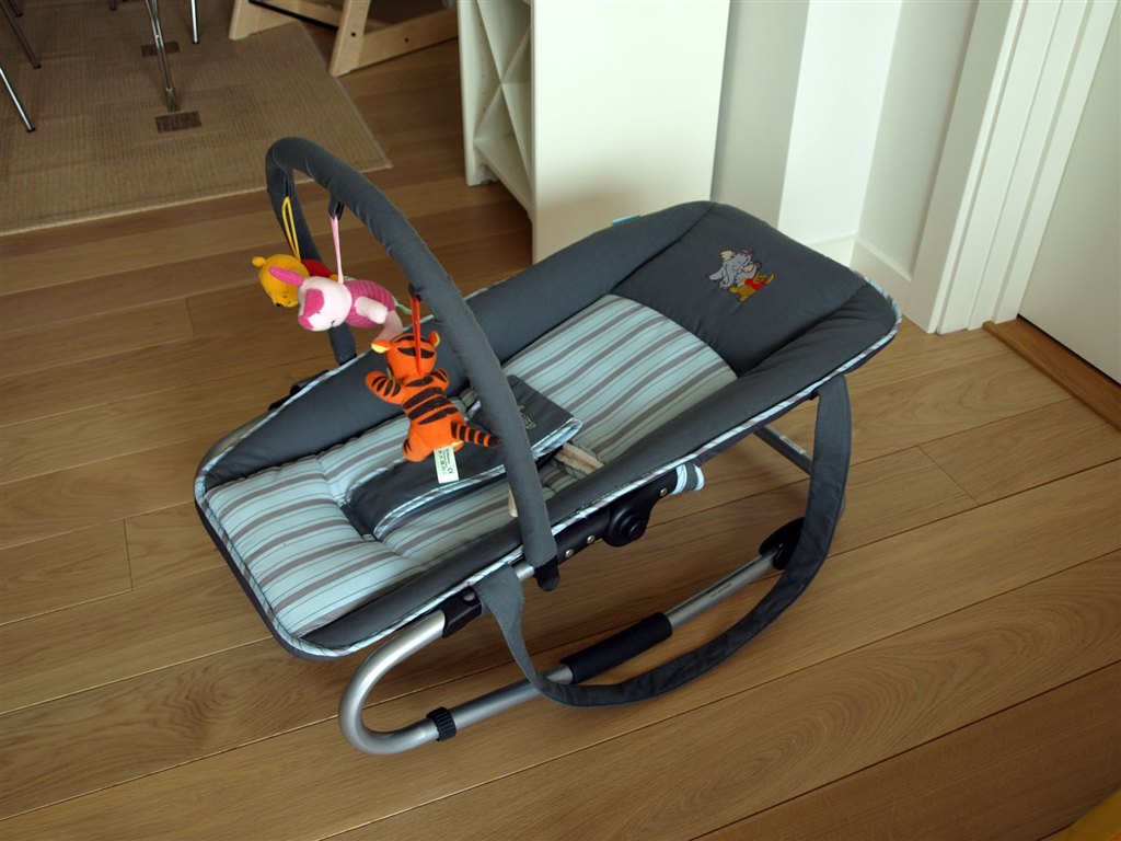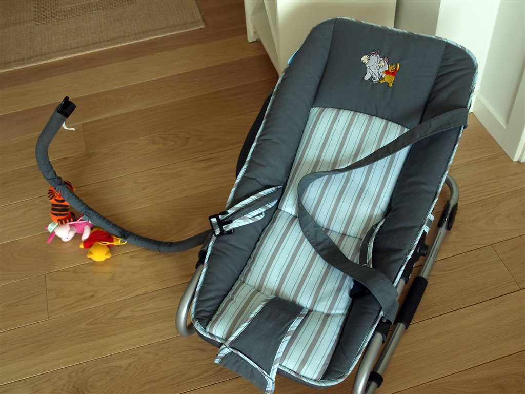 Stolen har liggebeslag (justerbart ryglæn), regulerbar benstøtte, legetøjsbøjle og bærehanke.