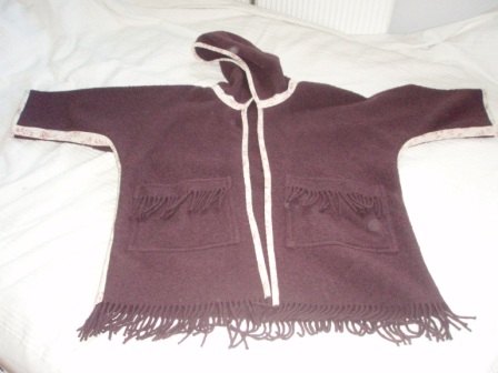 Lækker poncho-agtig jakke i uld. Perfekt til at lune den voksende mave. Lukkes med en stor sikkerhedsnål (følger med).