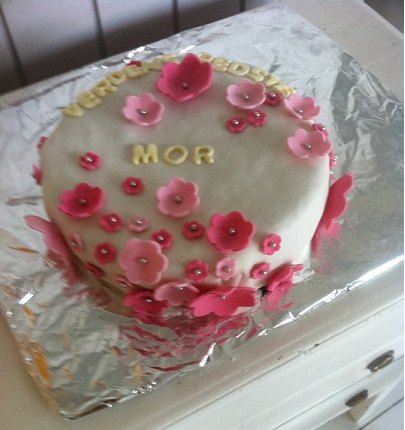 I og med min mor ikke arbejder om søndagen syntes jeg at hun skulle have sin kage idag på sit arbejde Det lykkedes mig dog at brænde mig på min fondante på 4 fingre på højre hånd ( er selvfølgelig højrehåndet) mens jeg var igang med at lave blomster så 2,5 timer under lunken vand også kunne jeg fortsætte, også op kl 5 imorges for at sætte den sammen