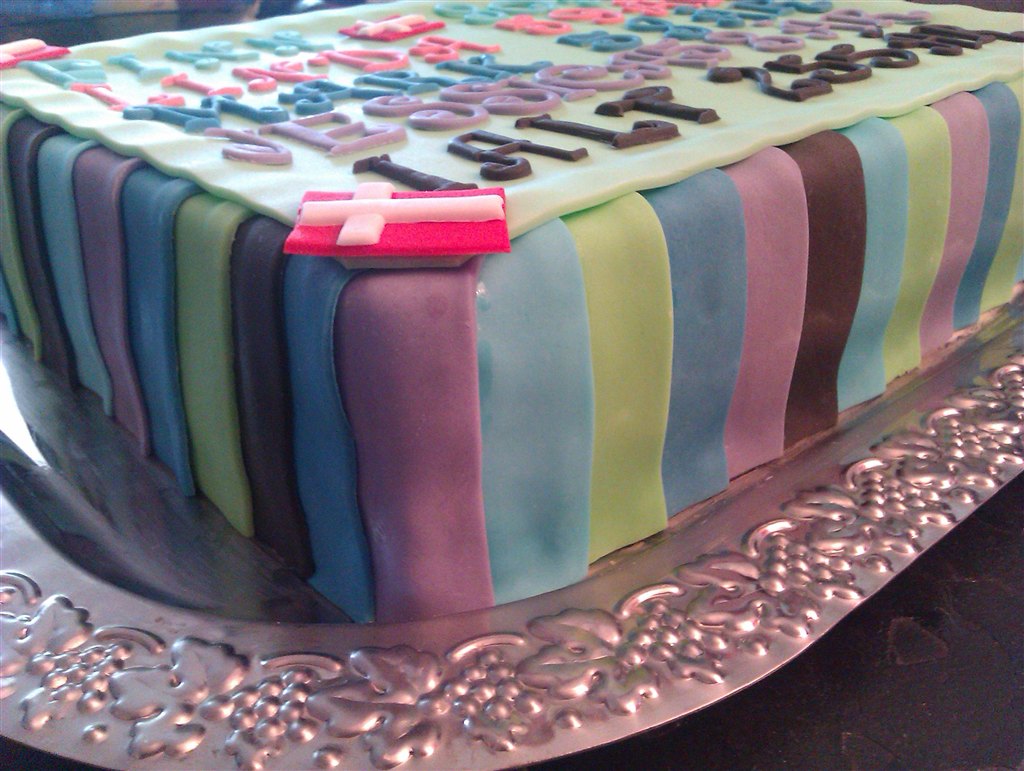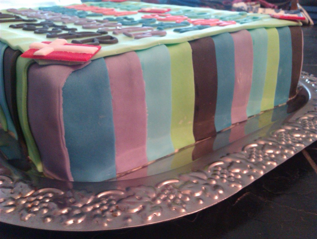 Lavet med lysebunde med marzipan i, med jordbærmousse og tobleronecreme, med jordbærsmørcreme og pyntet med fondant i mange farver.