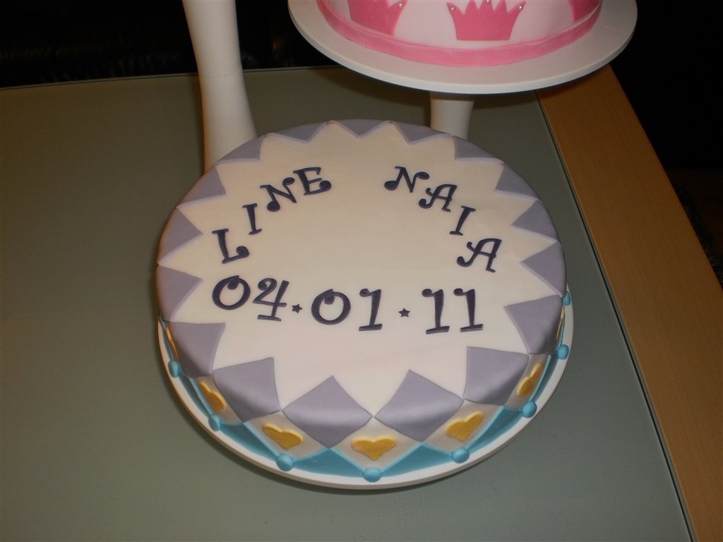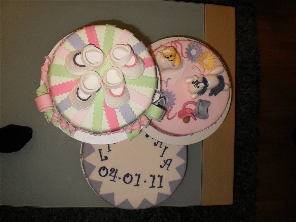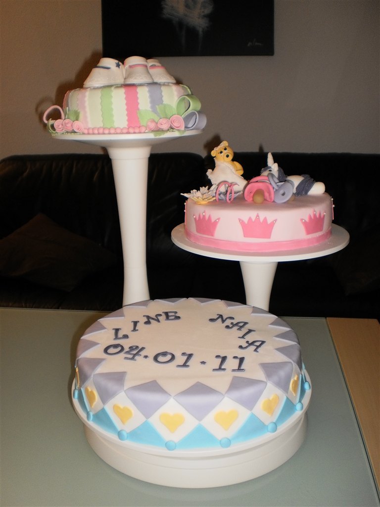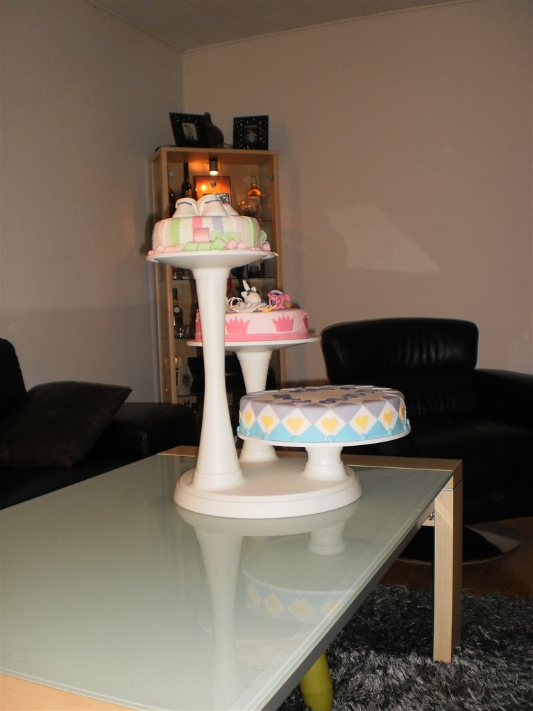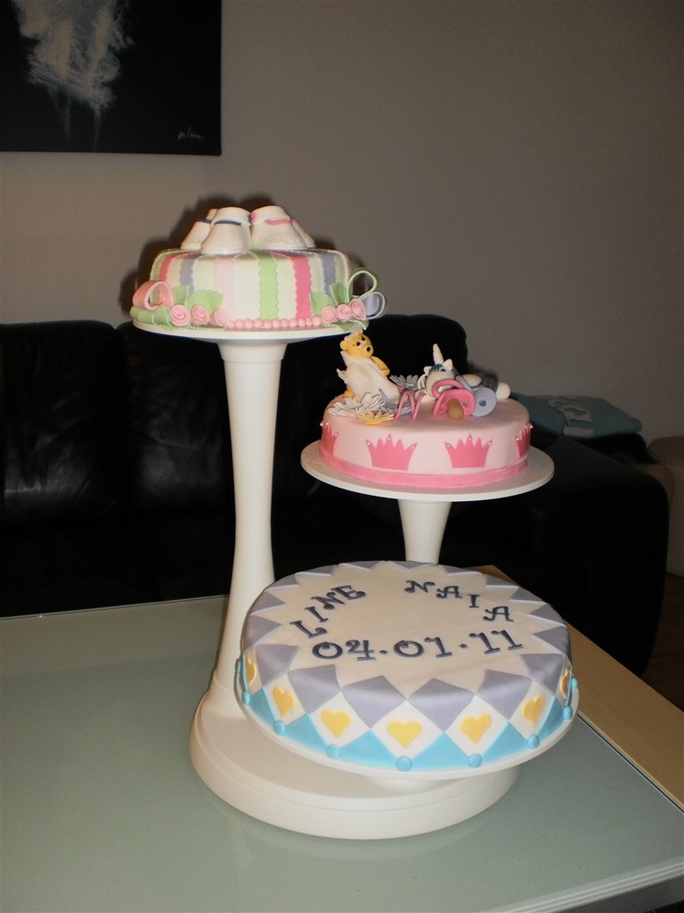 | Dåbskager Nr.1: Blåbærdrøm (Blomsterbergs chokoladekagebunde + Blåbær a la Blomsterbergs creme) Nr.2: 2xLyse bunde + 1xMud cake bund + Hindbærmousse + Mørk toblerone creme Nr.3: 2xBlomsterbergs chokoladekagebunde + 1xMud cake bund + 1xBaileys creme + 1xVanilla creme |