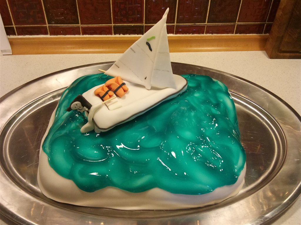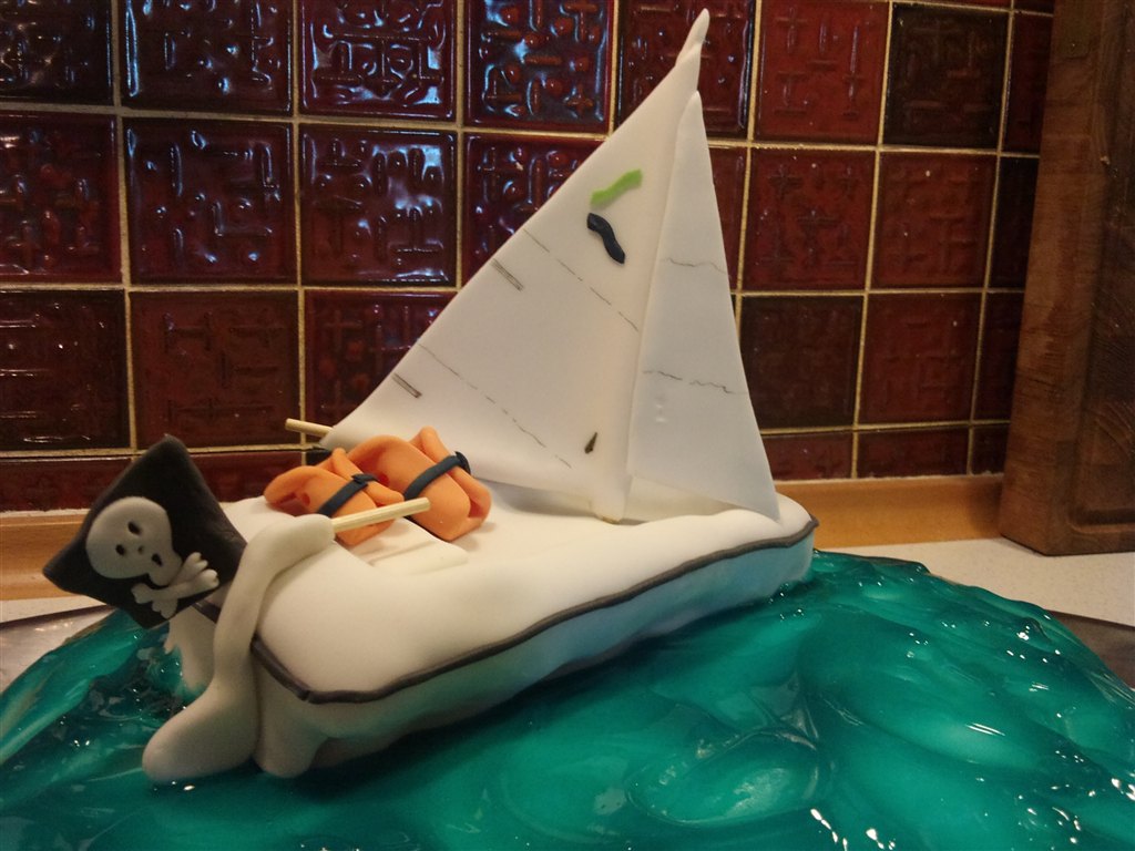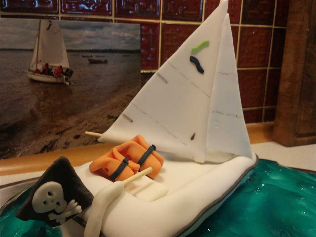Dot D skriver: Jeg har næsten lige lavet den her. Båden er også kage, det er lagt i lag, også har jeg skåret ud og til, og tilsidst smurt op inden fondant