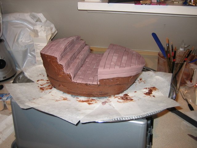 har desværre ikke billeder men jeg ville bygge chokolade kage op på hinanden og til sidst skære hul i midten og skære til i siderne og så ligge fondant og blå royal ising som vand det blev super fint her masten brugte jeg sugerør overtrukket med brun fondant