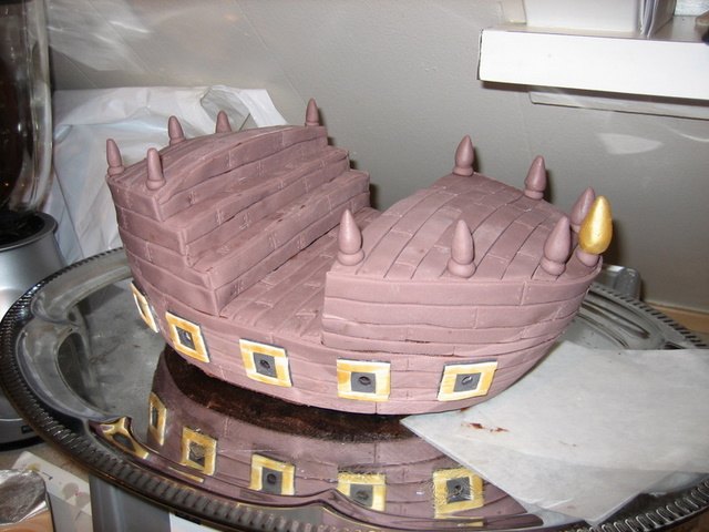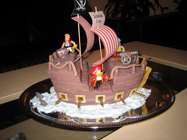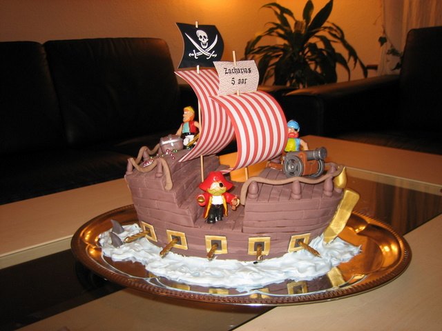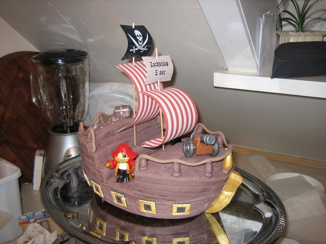 Anasmor skriver: Ved ikke om du kan bruge det her til noget... Det er en sørøverkage jeg lavede til min søn for 5 år siden, men du kan måske få ideer til opbygningen
