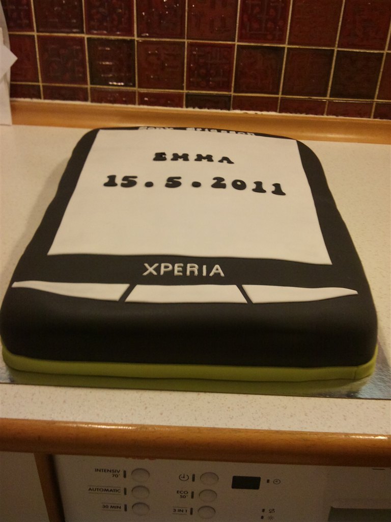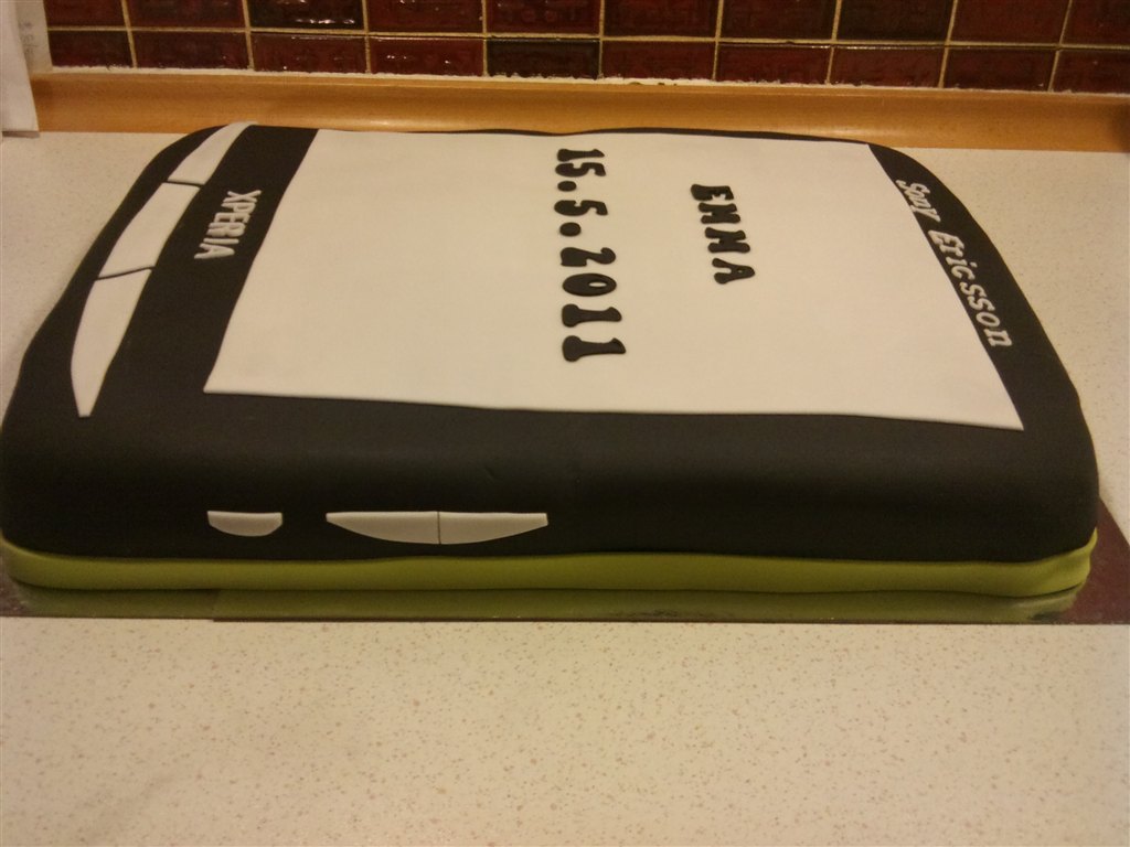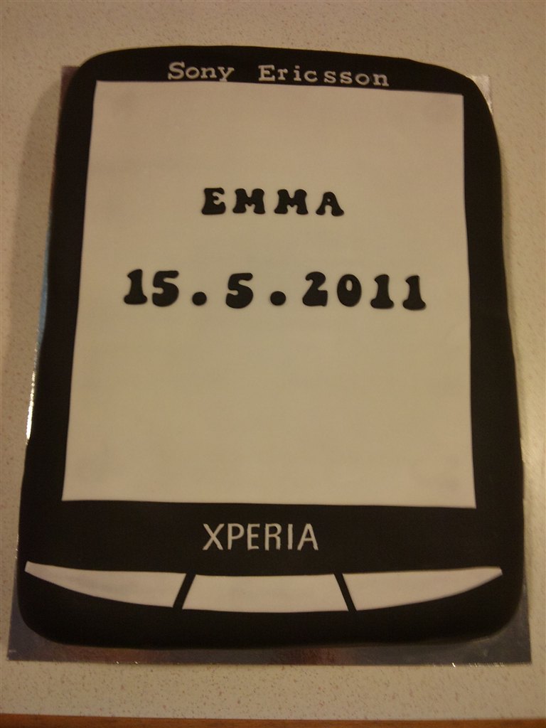 Så blev det til en enorm stor mobiltelefon-kage til en konfirmation her i weekenden. Emma har en Xperia telefon, så den ville jeg prøve at lave i stor. Den blev 32 x 42 cm, så lidt over normalstørrelse, hi hi. Det er chokoladekage med chokostykker og hindbærmousse...