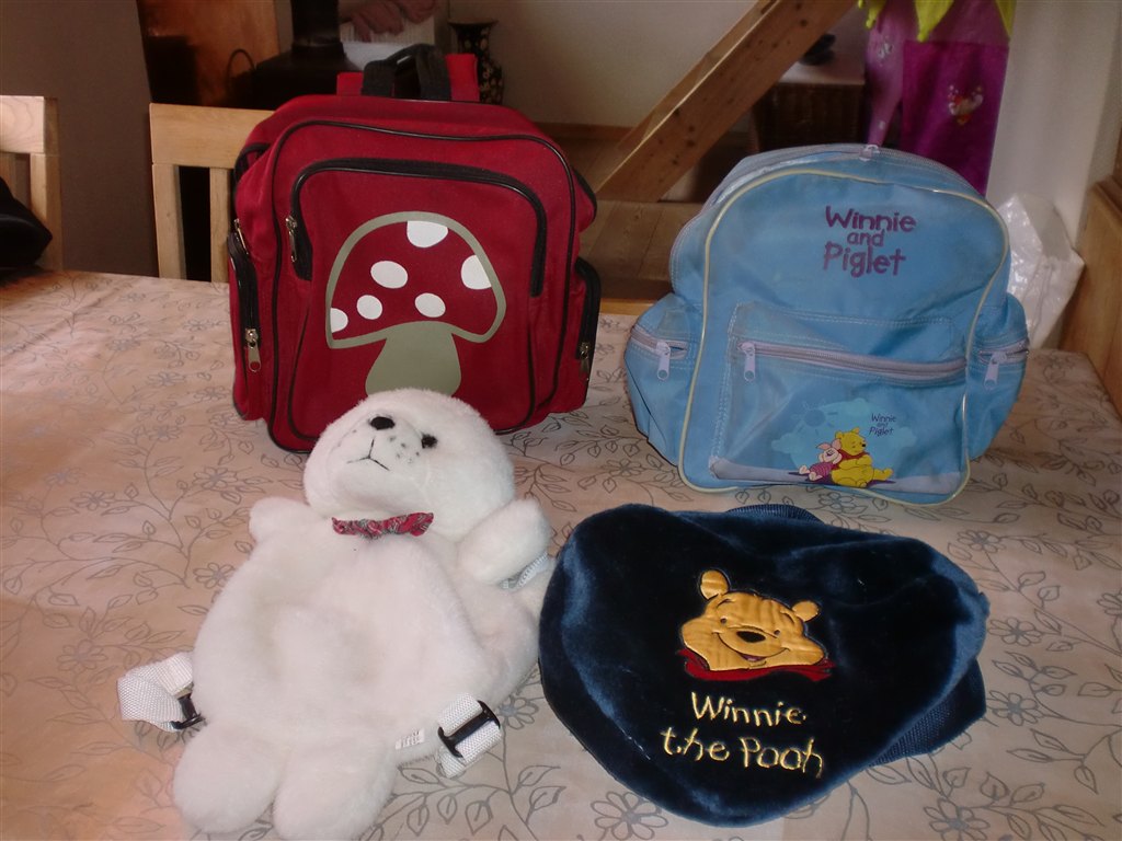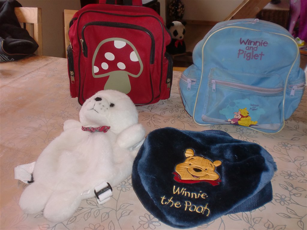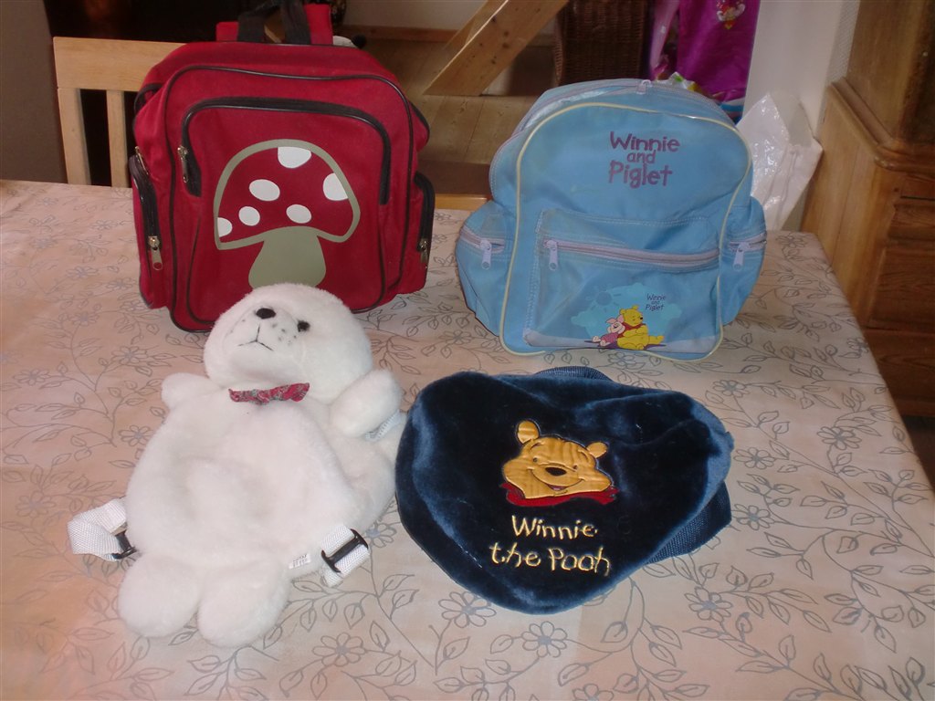 20 kr. pr. styk for de 2 bløde tasker forrest på billedet.30 kr. pr. styk for de to tasker bagerst med svamp og lyseblå Peter Plys