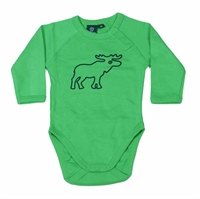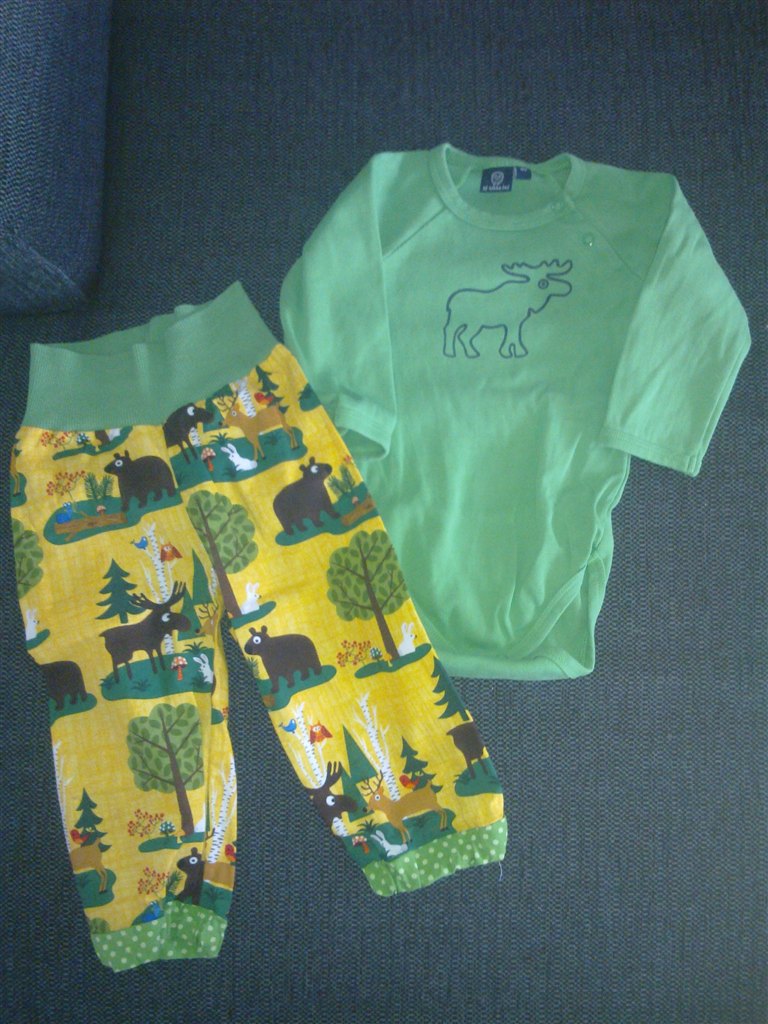 Den er en str. 80 og bukserne svare også dertil. Body'en er mere grøn i farven, men blitzen snyder lidt, så i får også et billede lånt fra nettet for at se farven bedre. Sætter er kun brugt et par gange, da det altså er lidt for drenget til Emilie.