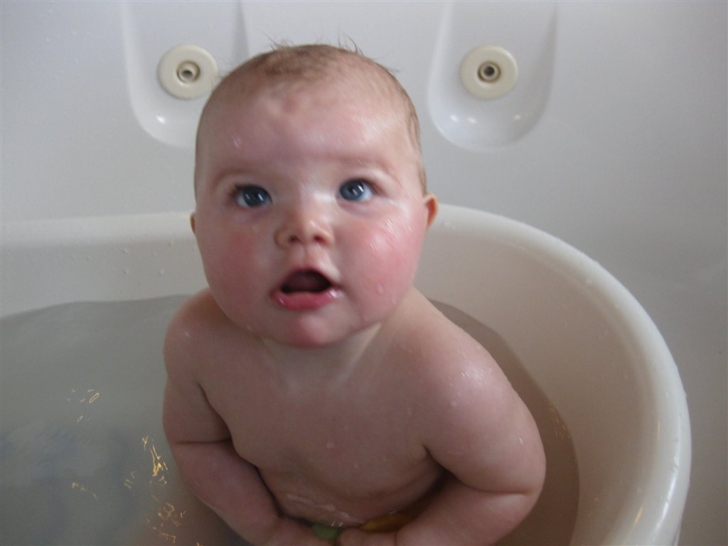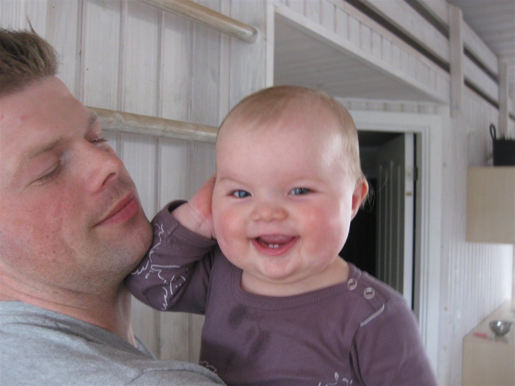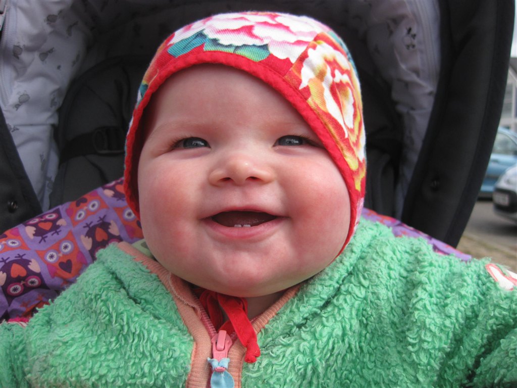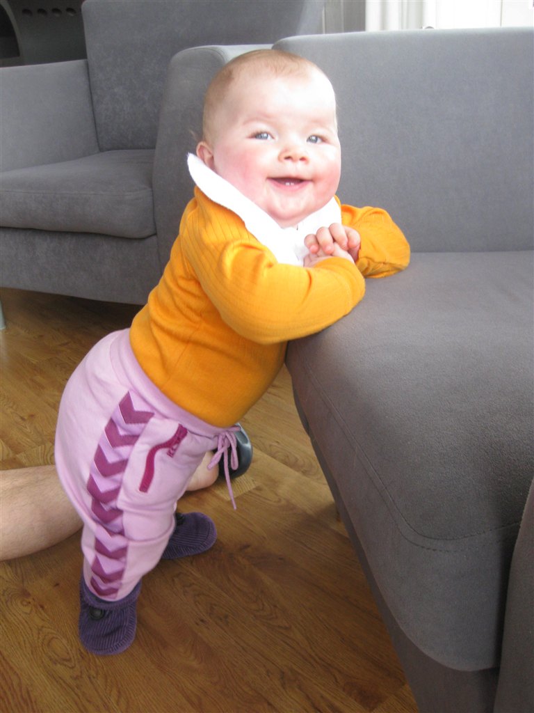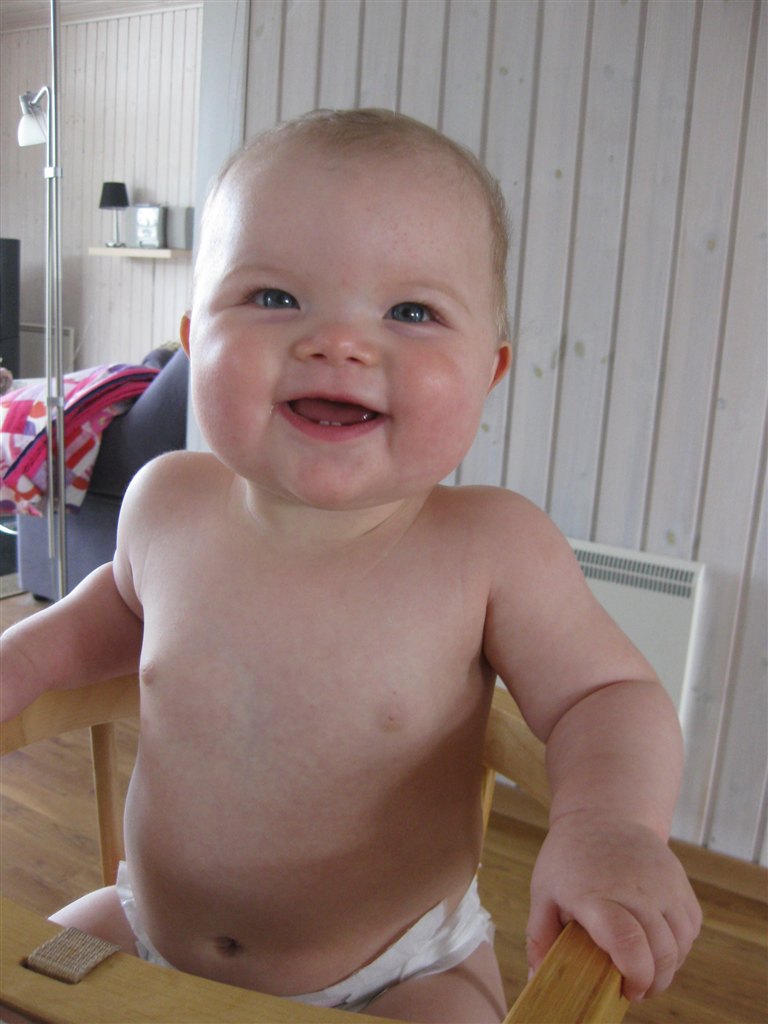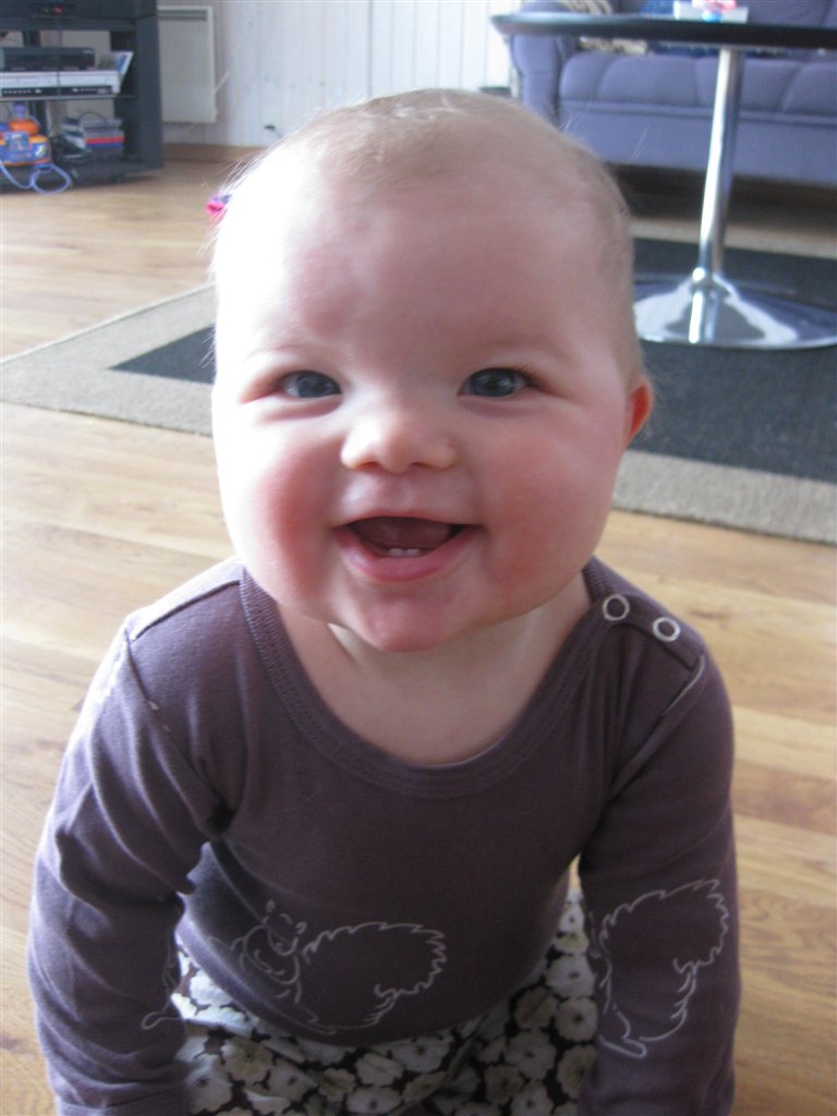 Hun har rundet de 10 kg, kan stå selv op af ting, sidder fuldstændig stabilt (har gjort det siden hun var 5½ mdr), sover stadig meget om dagen OG hele natten, er altid i GODT HUMØR og er i det hele taget helt igennem skøn og dejlig!!!