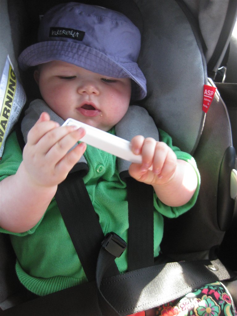 Hun har netop fået to tænder MERE - de to fortænder i overmunden.... så nu skærer hun lystigt tænder til forældrenes store rædsel!!!! Er der noget, jeg simpelthen ikke kan holde ud, så er det lyden af den slags.... YAKS.... det er ikke rart!!! Vi prøver at give hende en masse andet at bide i, men det er ikke altid det hjælper
