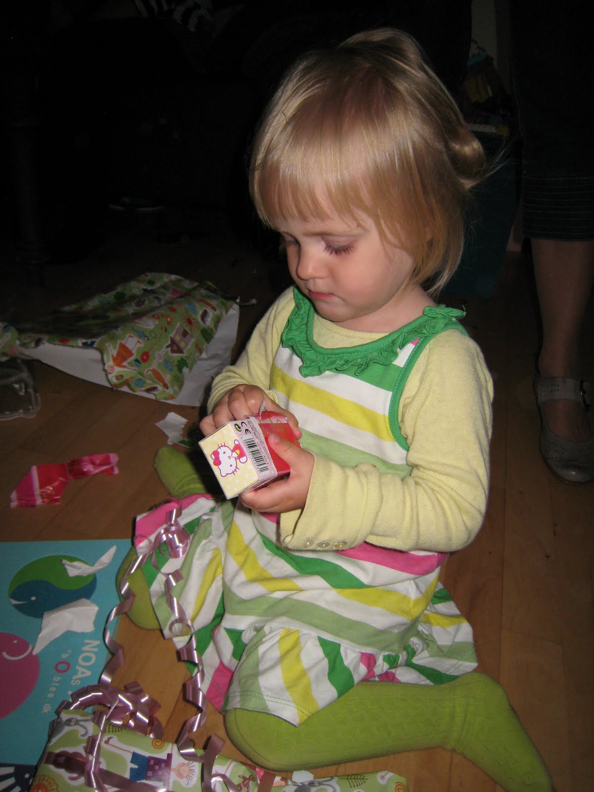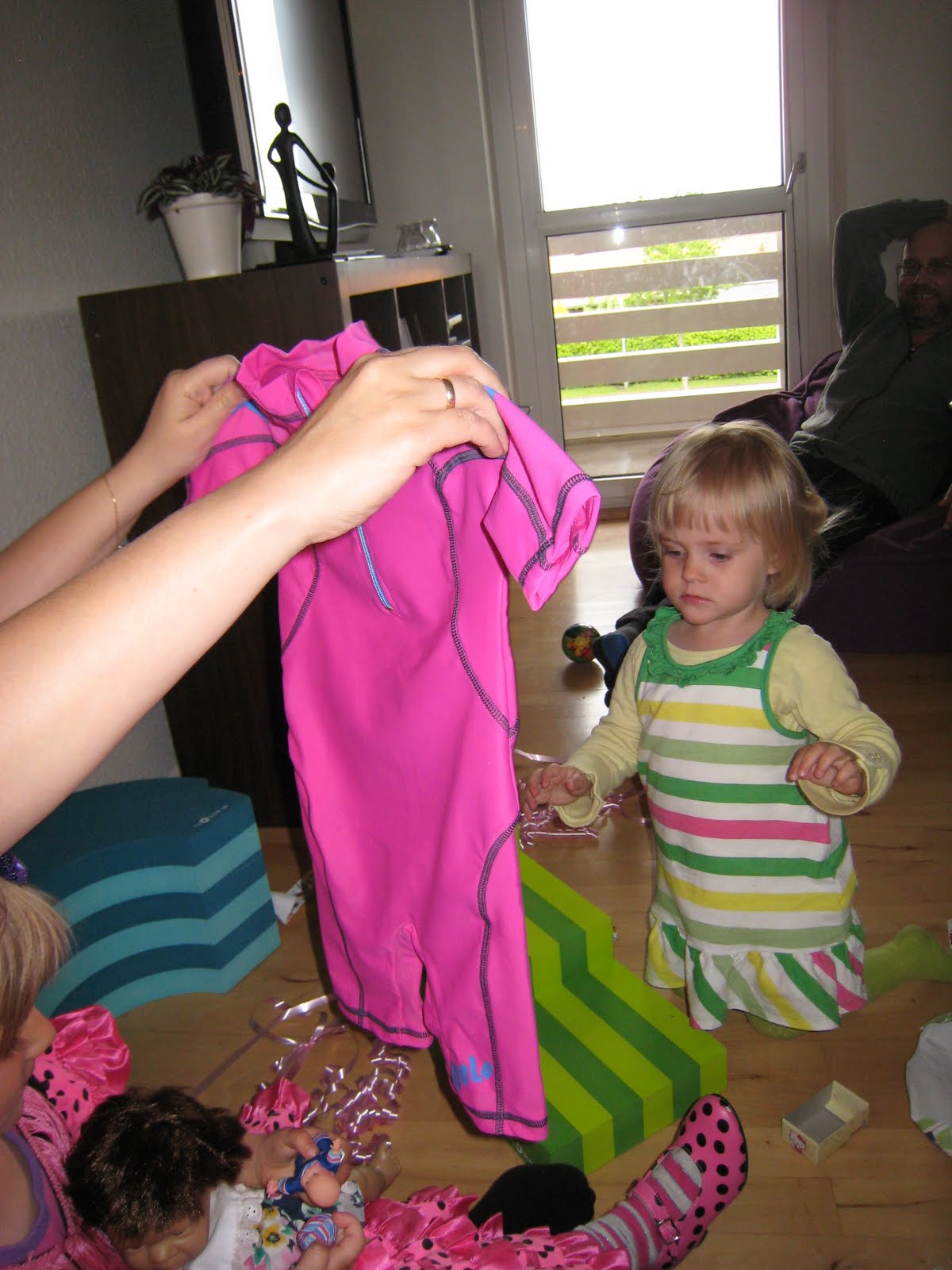 Lige inden aftensmaden dukkede Jakob, Nanna, Bedstemor, Bedstefar og Sille op. Lina pakkede endnu et bObles tumlemøbel op samt en UV-badedragt, bObles Noahs Ark-puslespil, minidukke (som også Annika fik en af). Annika havde, som I kan se, dressed sig op i dagens anledning