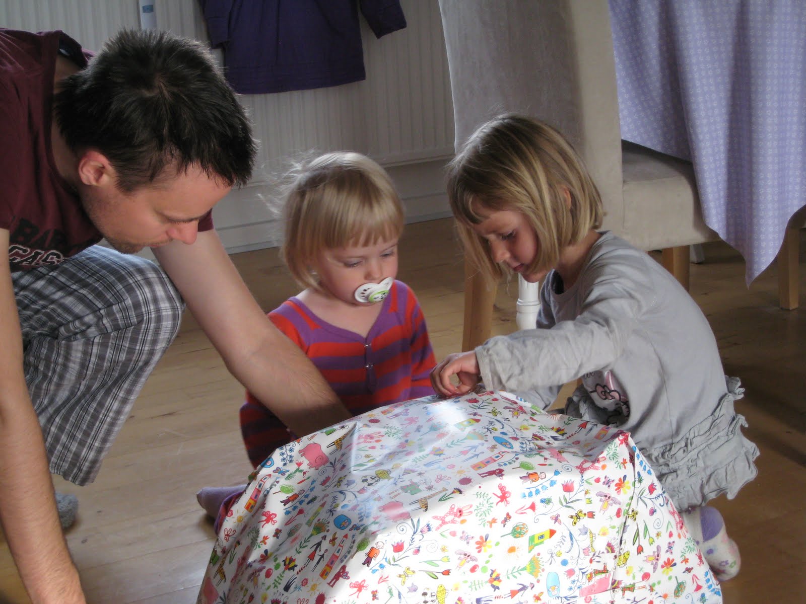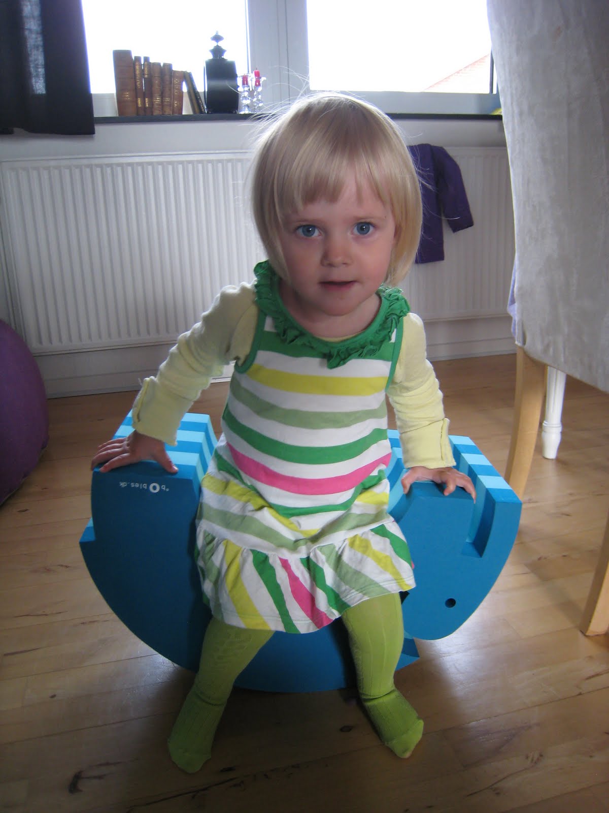 Aftenen inden hendes fødselsdag, havde vi traditionen tro pyntet stuen med flag og sat hendes fødselsdagsgave frem. Vi havde ikke sat noget væggeur, da vi bare skulle nå vuggestuen til kl. 9. Men begge tøser sov helt til 7:30, så vi nåede alligevel at få lidt travlt. Da Lina vågnede (af sig selv) listede vi alle tre ind og sang fødselsdagssang. Pigen der altid er glad nød opmærksomheden i fulde drag, kvitterede med et bredt smil og bad om " Synge Linas dø'sda' mere", og så sang vi da endnu engang for solstrålen