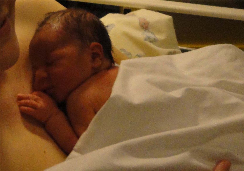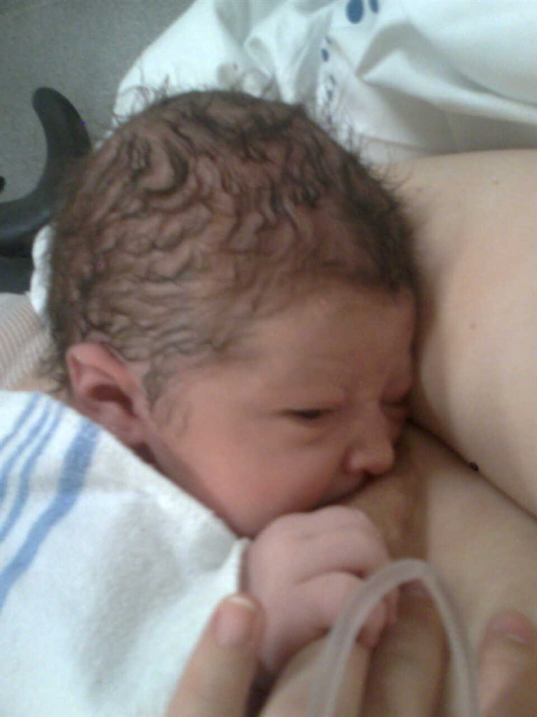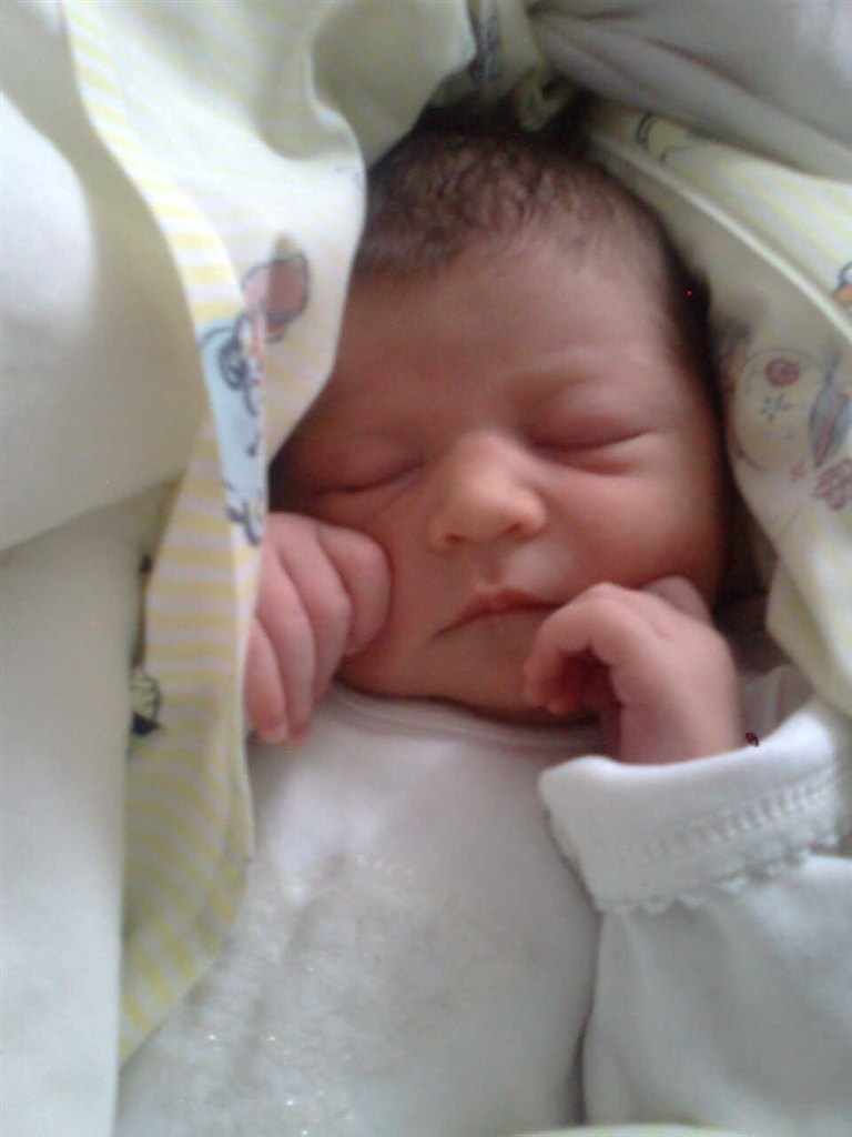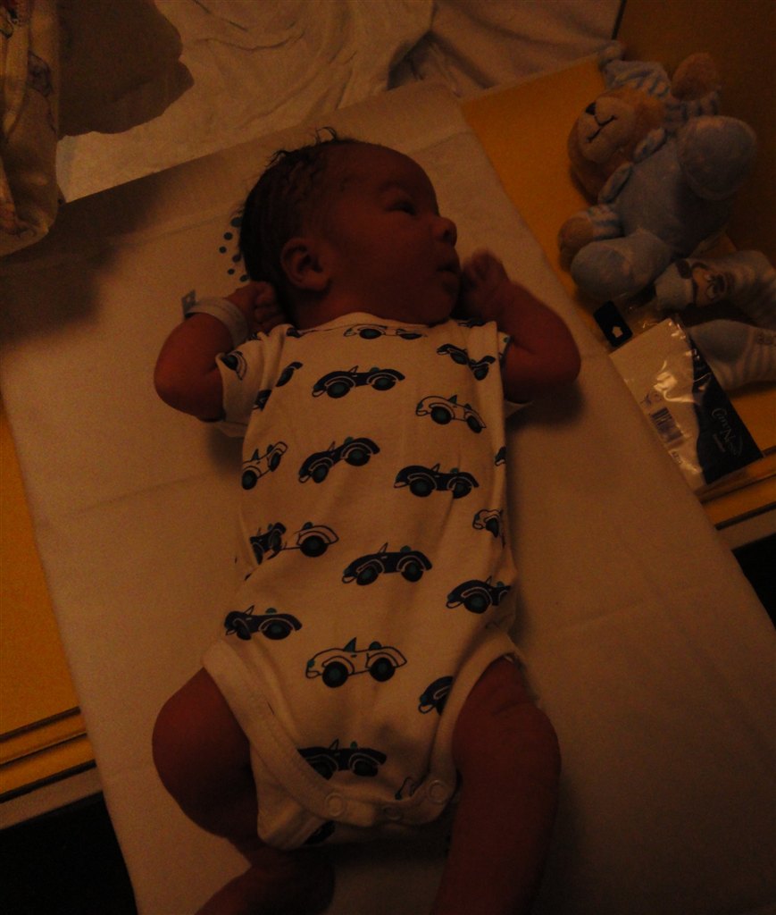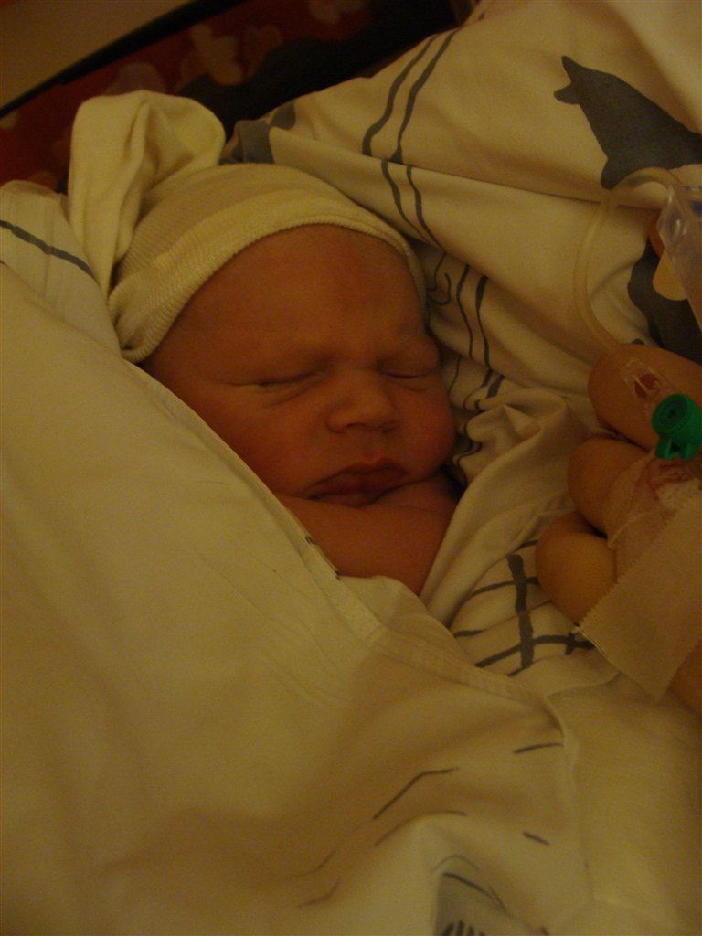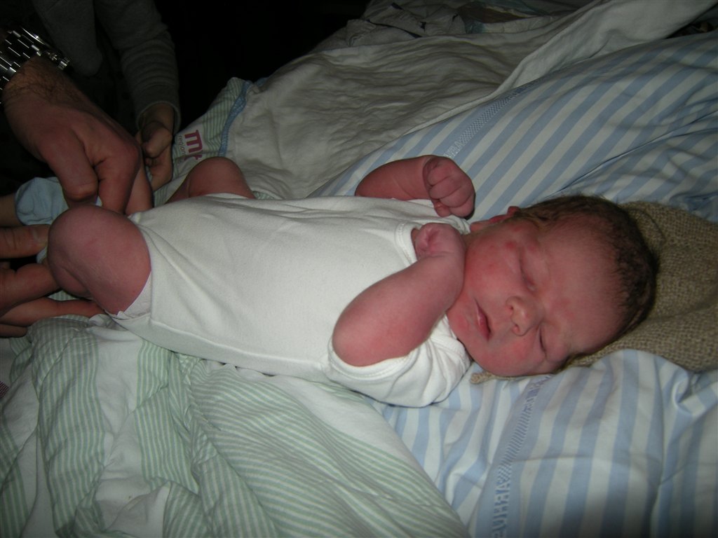 På det billede hvor han har en hvid body på og lukkede øjne, der kan man se de røde/blå mærker han fik i siden af hovedet/ved tindingerne af at blive født