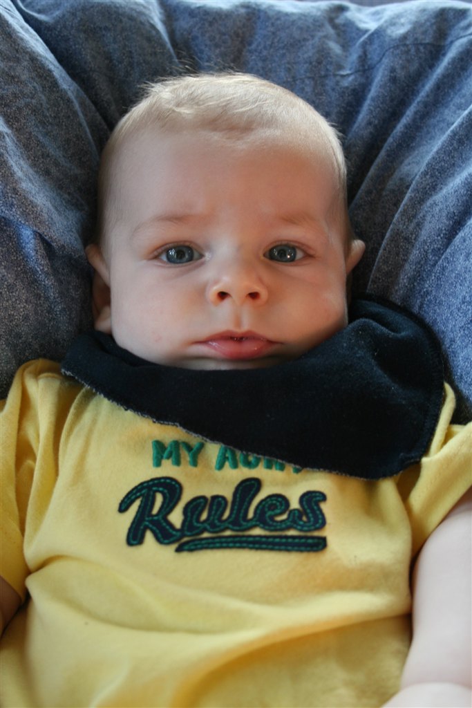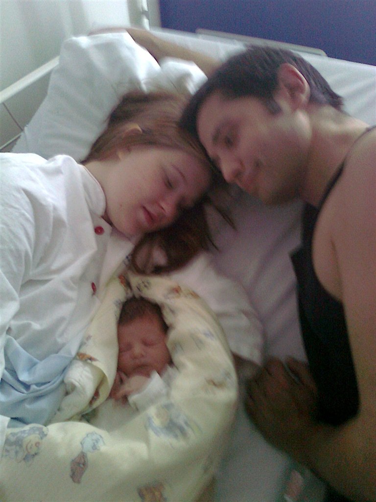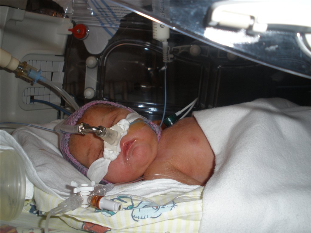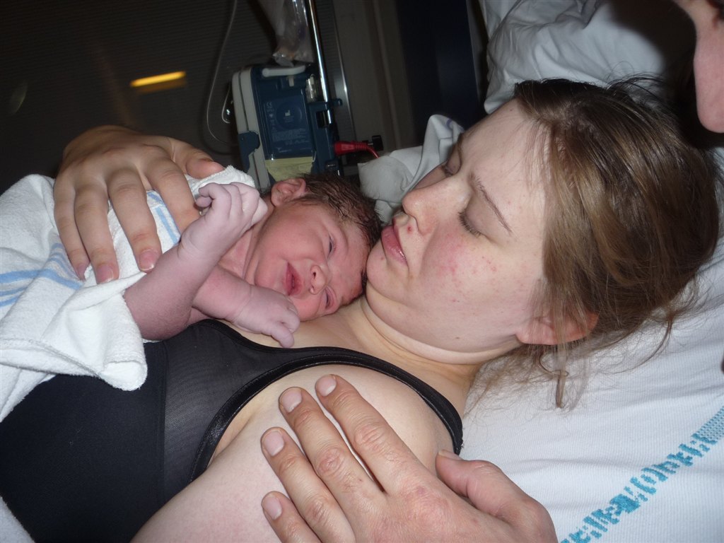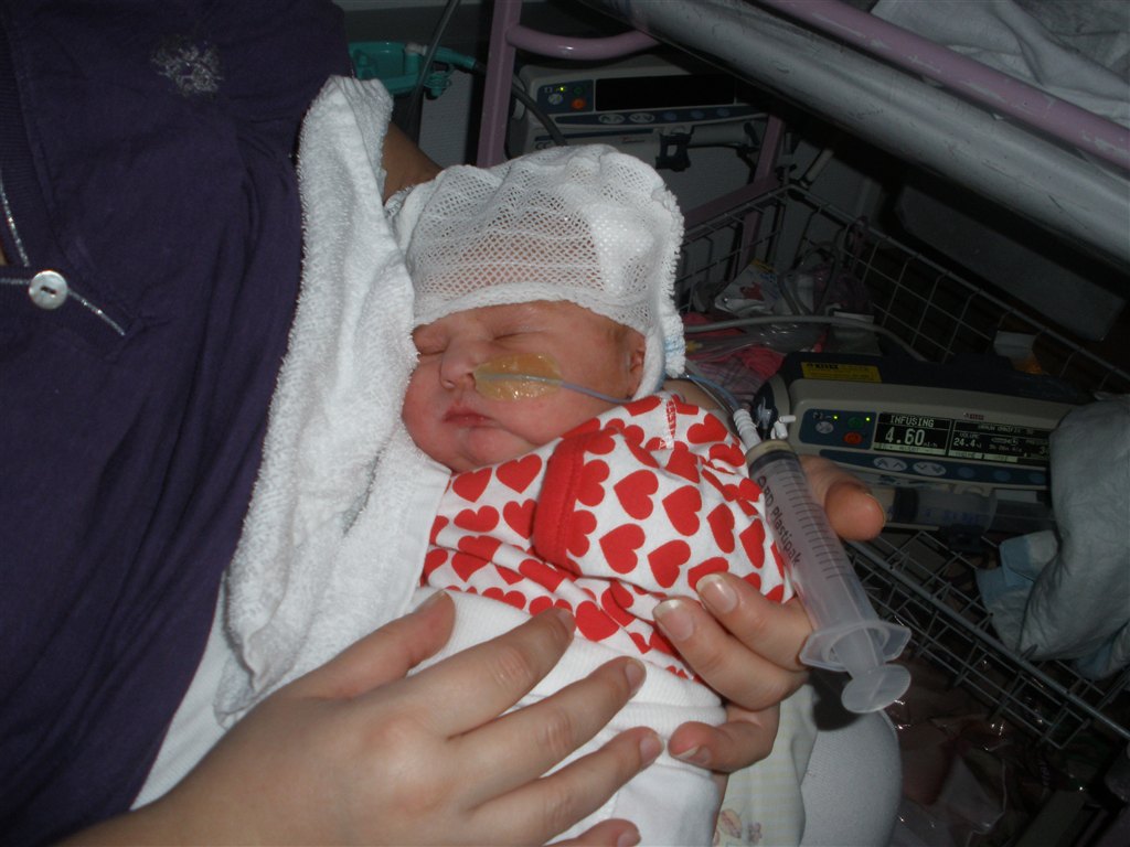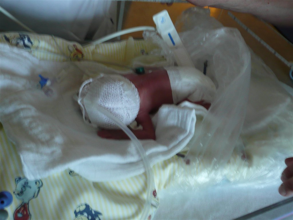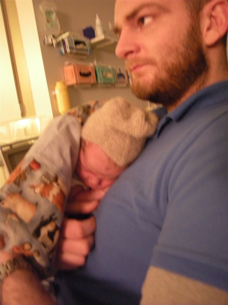 På det billede hvor han har en hvid body på og lukkede øjne, der kan man se de røde/blå mærker han fik i siden af hovedet/ved tindingerne af at blive født