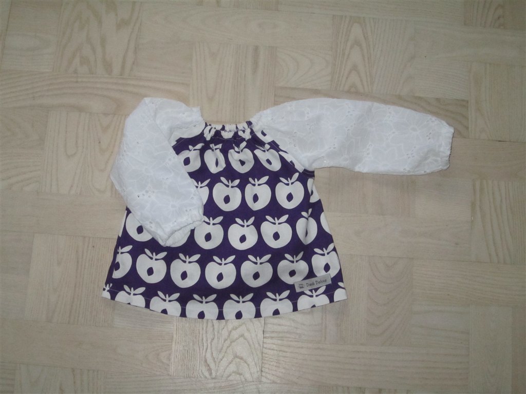 Den kan laves med korte ærmer, 3/4 ærmer og lange ærmer. Hvis jeg laver den 5 cm længere, kan hun stadig kravle i den, og så kan den også bruges alene med et par strømpebukser til.Jeg vender lige tilbage i morgen med nogle stofforslag.