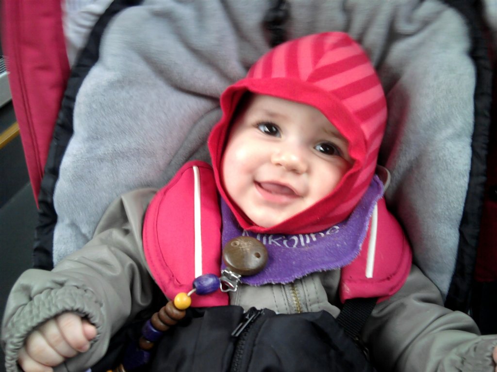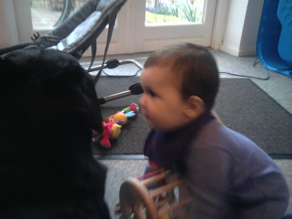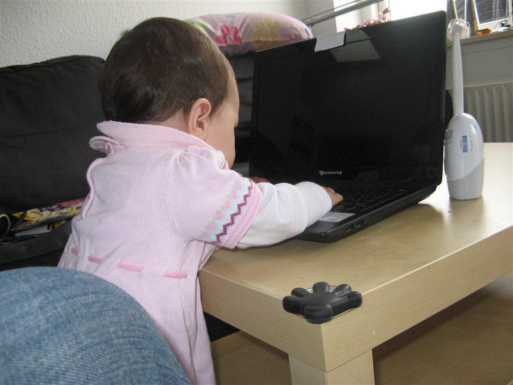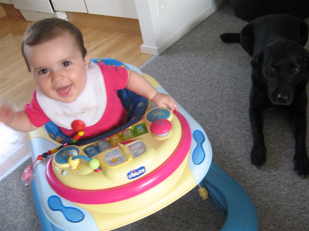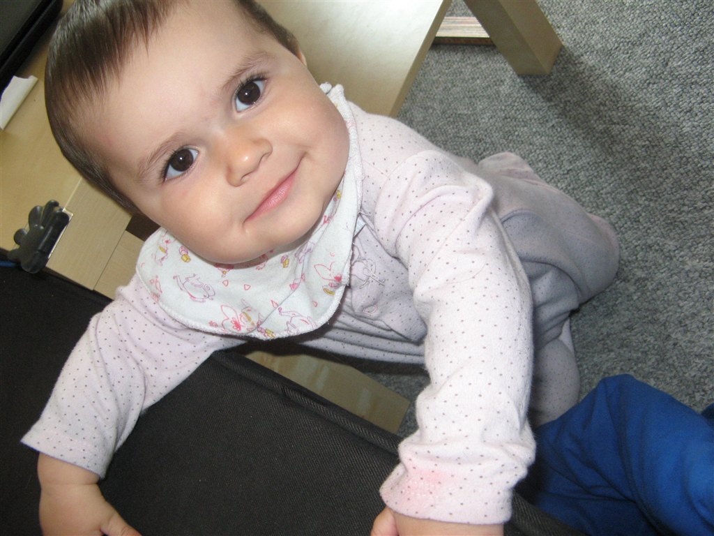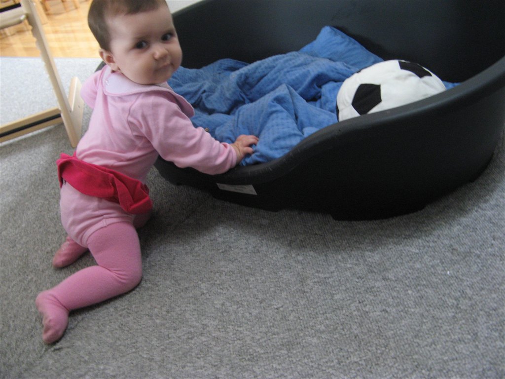 Hun har hele tiden været hurtig på den men synes det sidste stykke tid er det gået ekstra hurtigt, og hendes nyeste påfund er at holde fast i sofabordet mens hun går efter hunden eller prøve at komme til at trykke på computer tasterne. Men især vores hun har fanget hendes inreresse, hun griner hver gang den kommer forbi og kravler tit op i kurven til den.