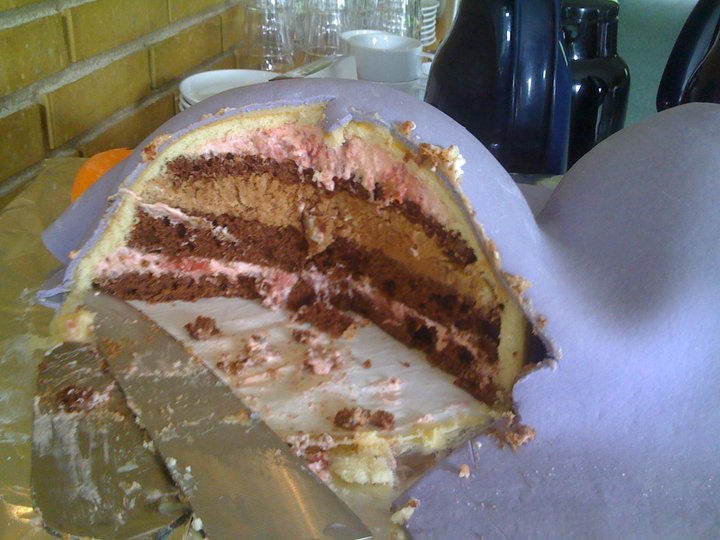 amo-kærnemælkskage (rød) med chokostykker (skulle lige kødsauce, men fik for lidt farve i)