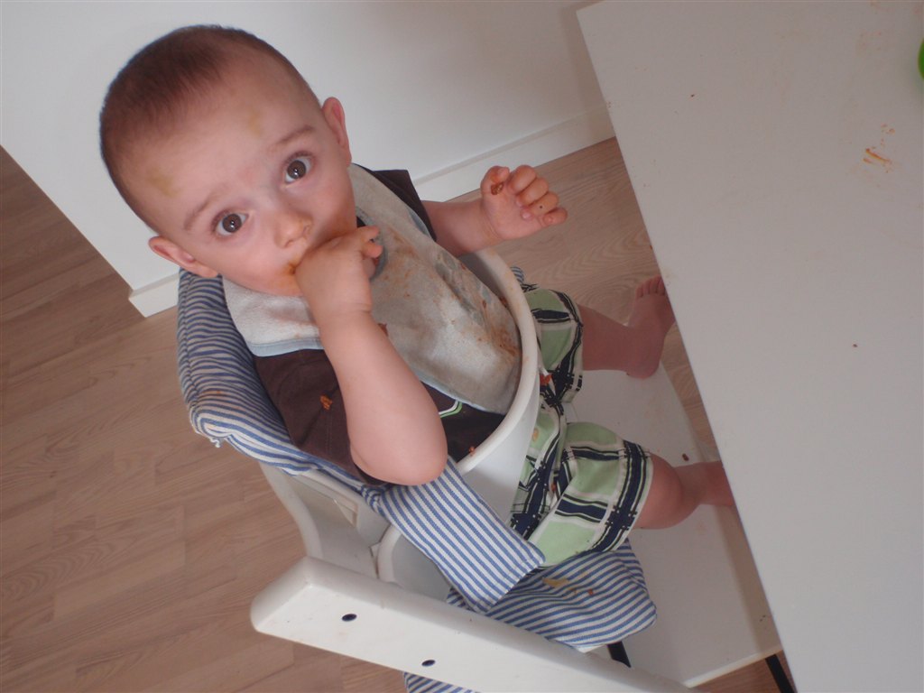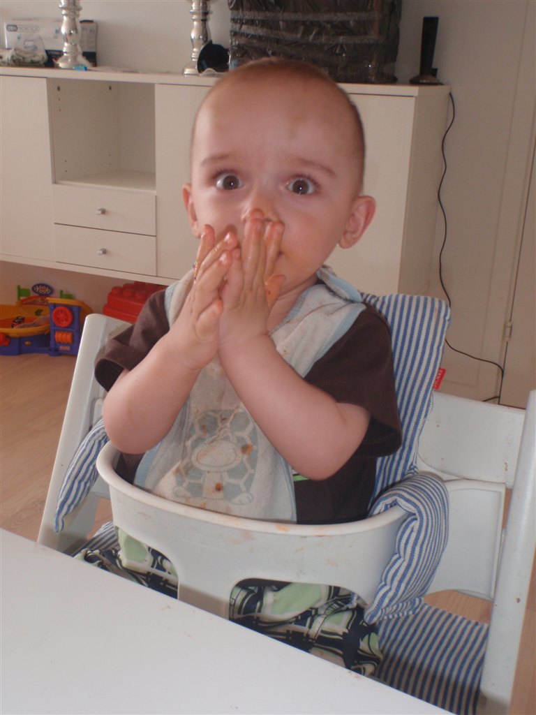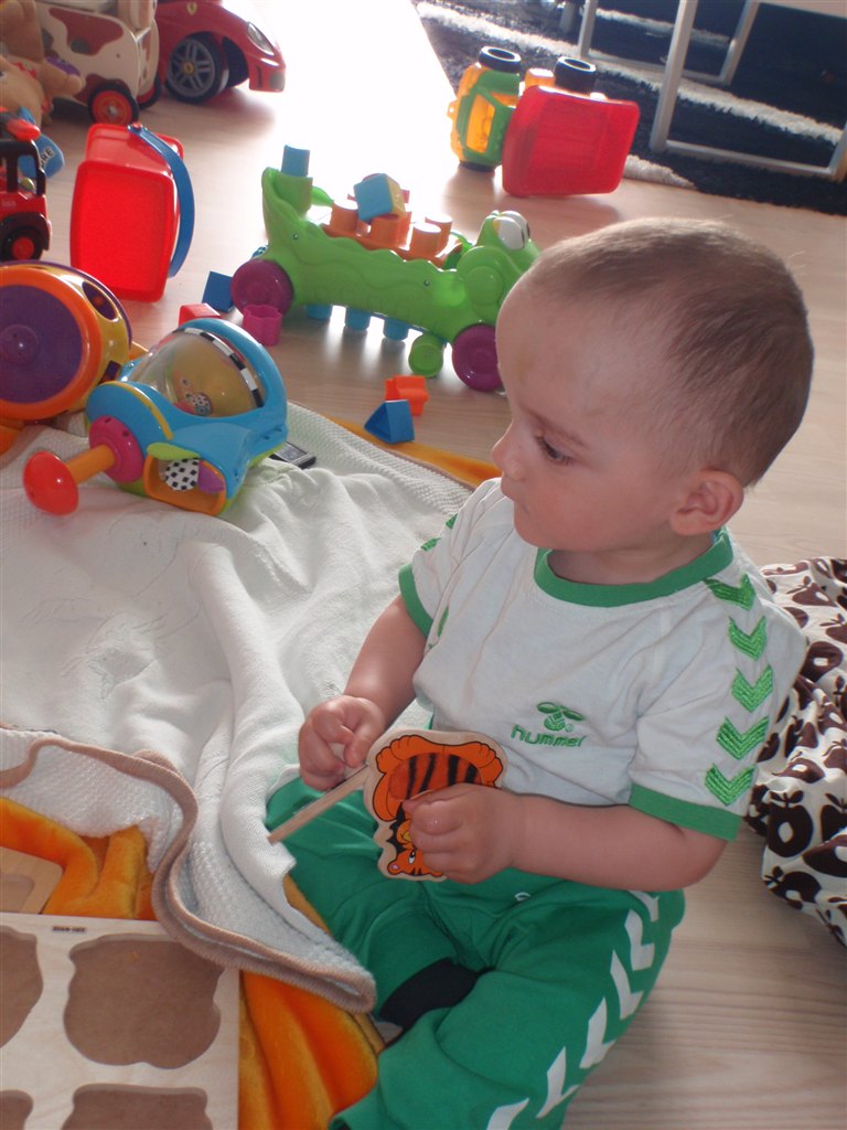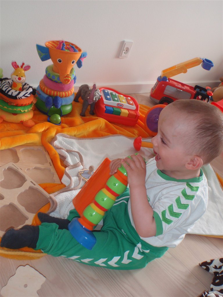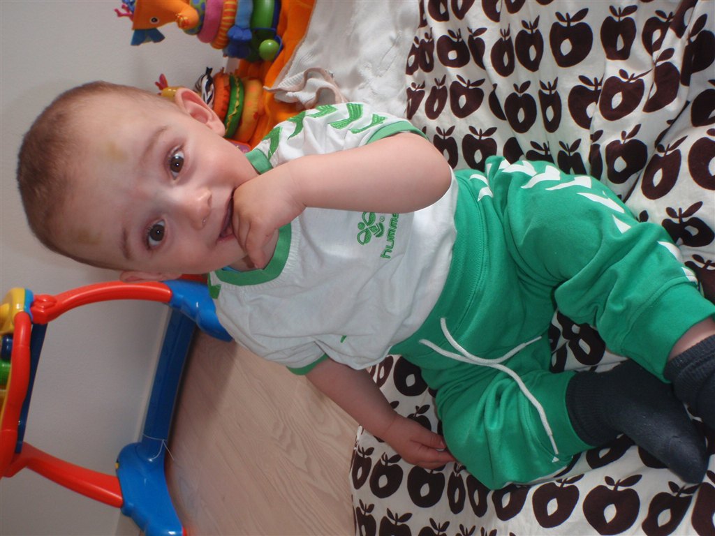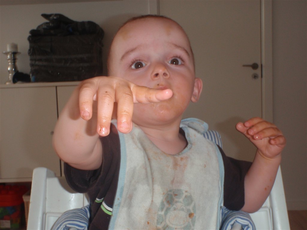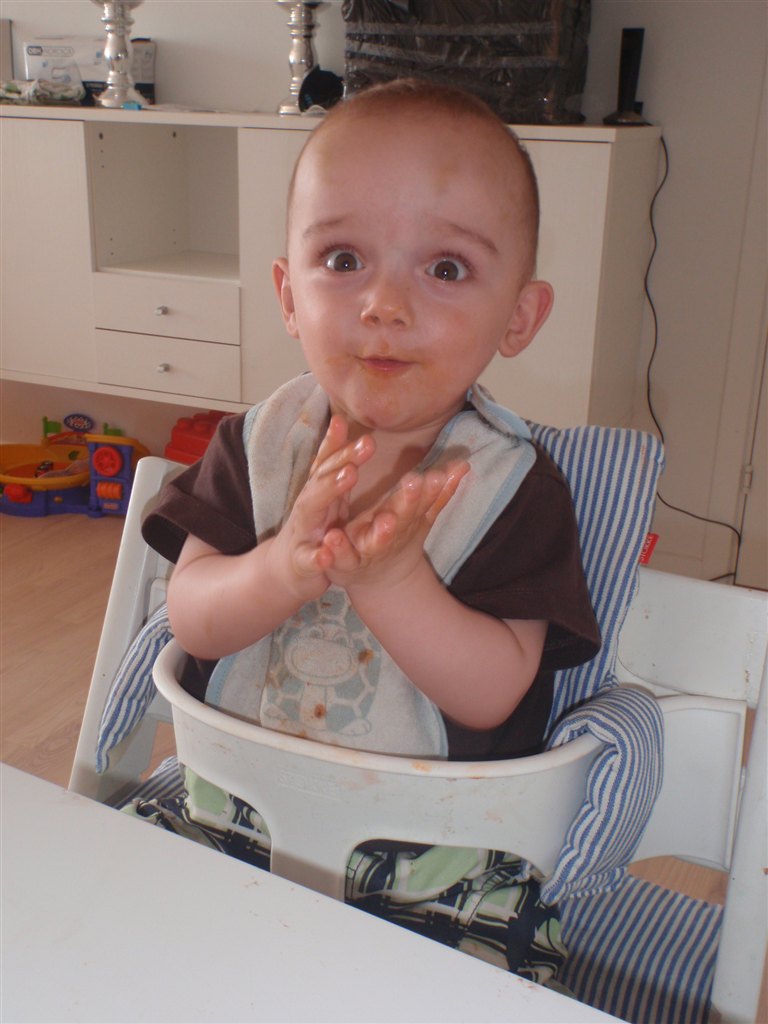 Han klapper, siger mama, baba, og rigtig godt til at fortælle hvad han vil ( ved at pege rundt på alting )