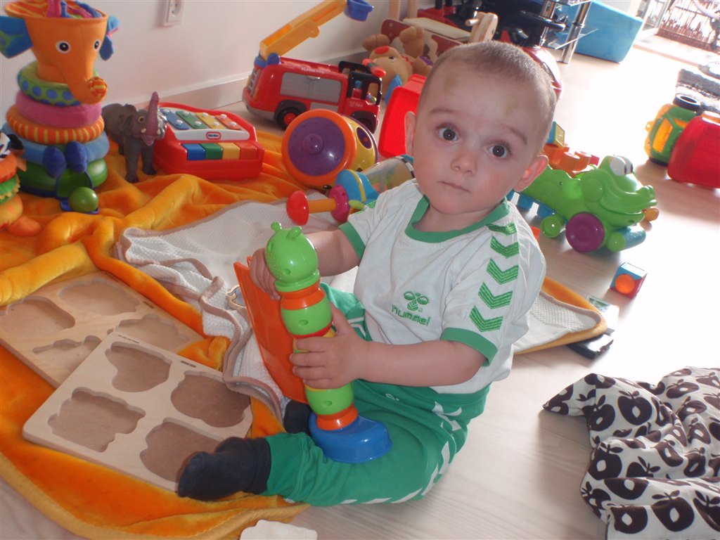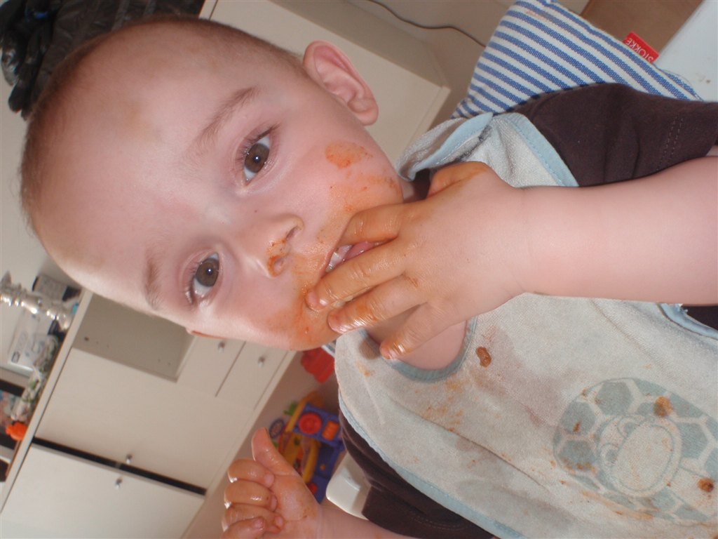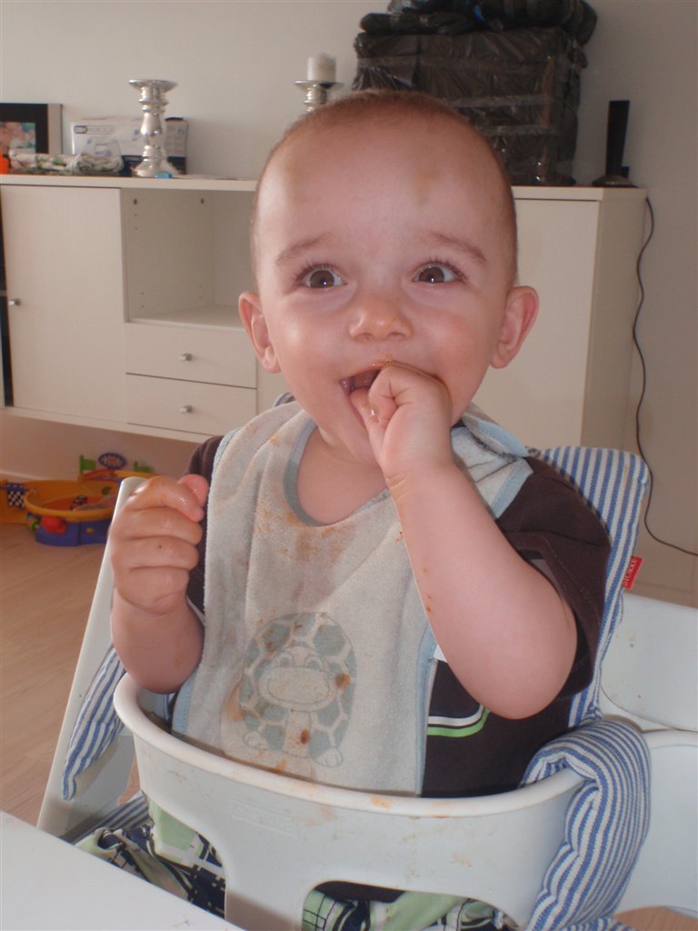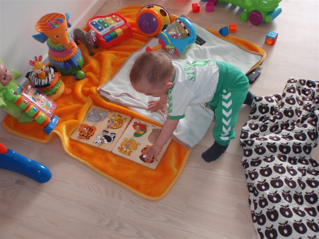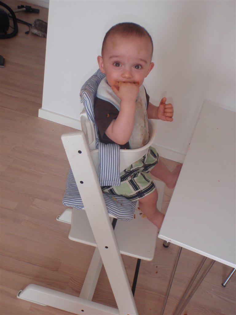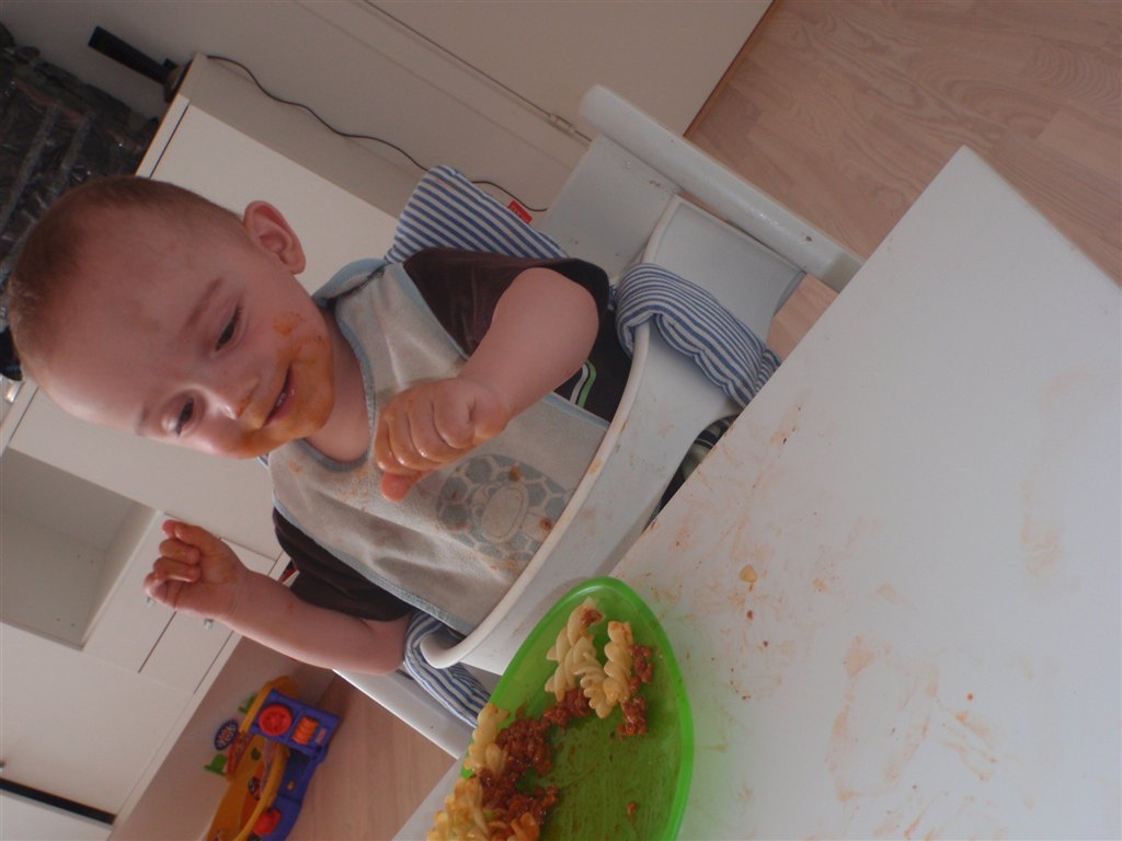 Han klapper, siger mama, baba, og rigtig godt til at fortælle hvad han vil ( ved at pege rundt på alting )