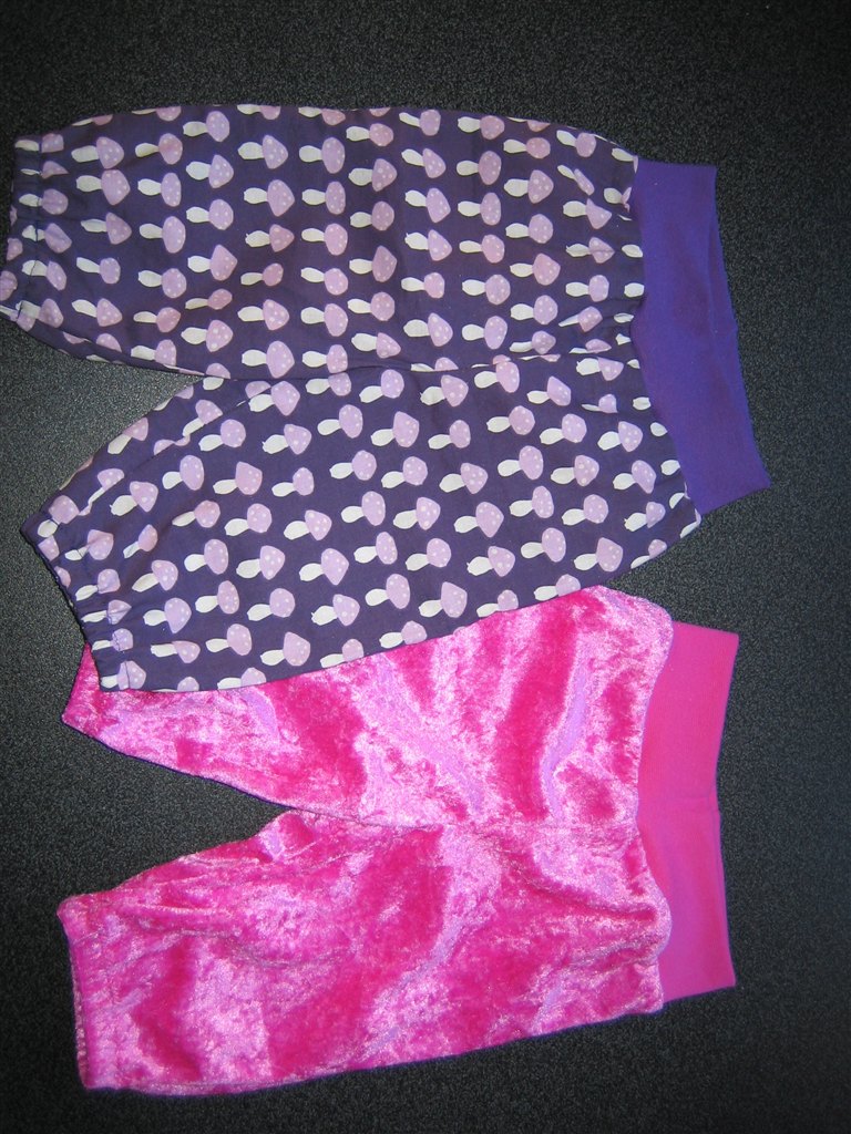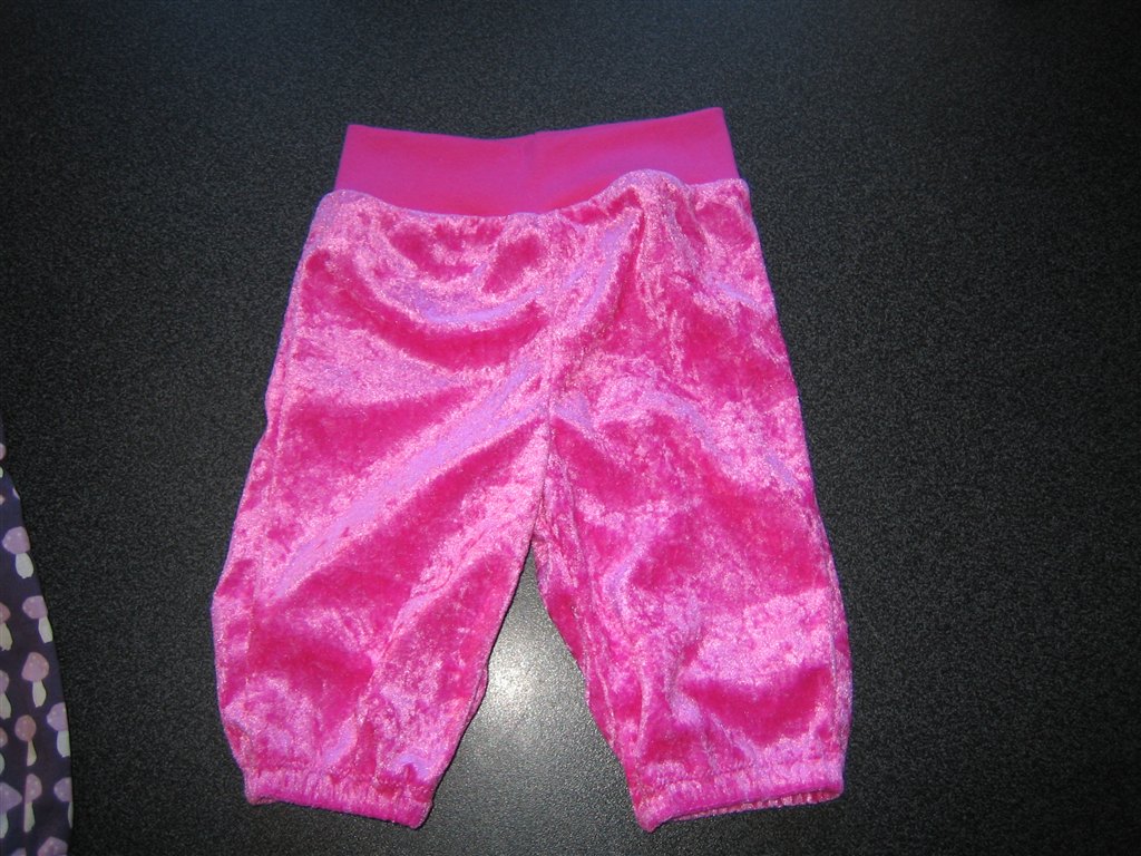 De lyserøde hvad er de lavet i?? Tænker om det er alm. velour eller nervøs?? Lige meget om det er den ene eller den anden af dem, så ville jeg nok tænke mig om inden datteren skal have dem på. Da det ikke er 100% bomuld, eller bare 95% bomuld så er de ikke til at ånde i, og hun vil pænt sagt>> DØ af varme... Men de vil være super til de mildere sommeraftener... Og elsker bare spillet i farven på velour