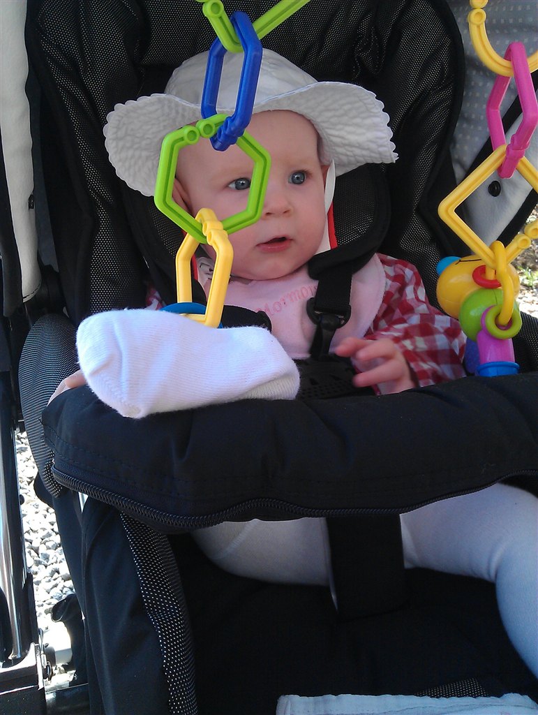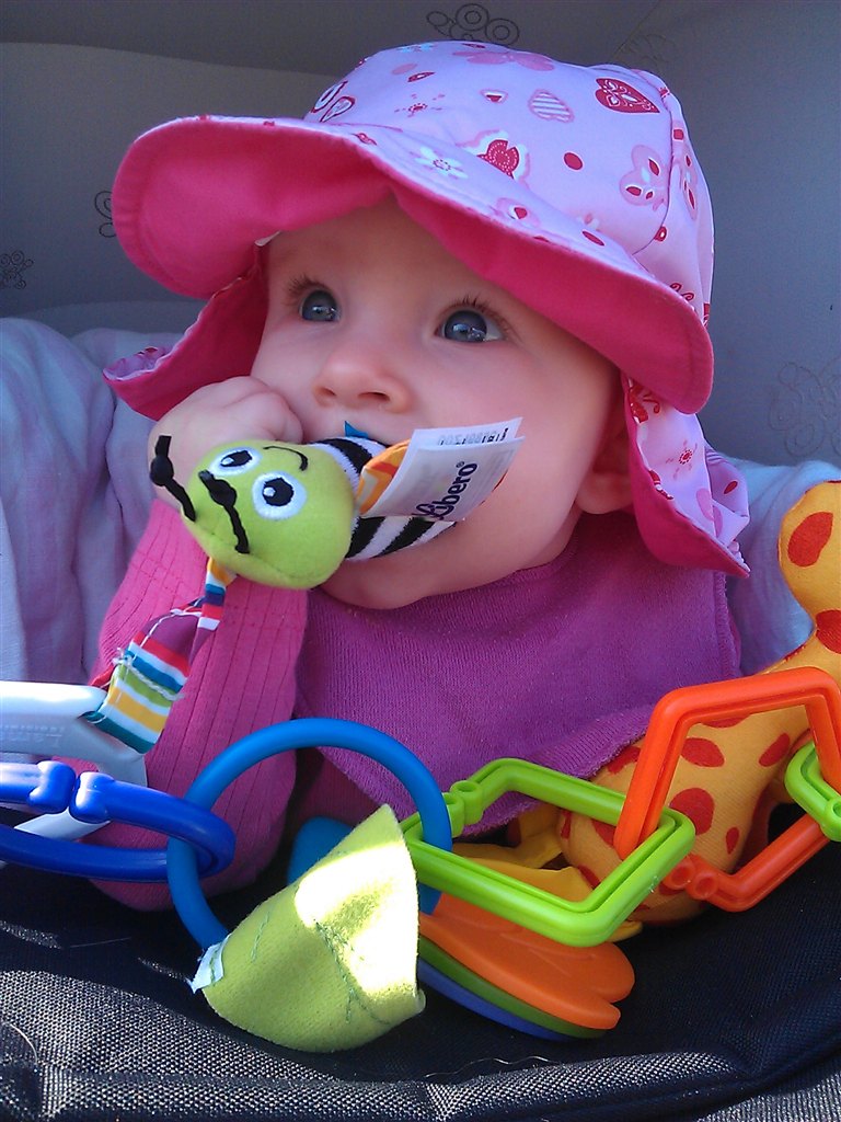 Jeg har sådan en sommerhat fra Pippi med snore til at binde ved hagen. Men men men, Julie vil ikke have den på, hun tager den konstant af.