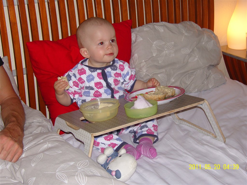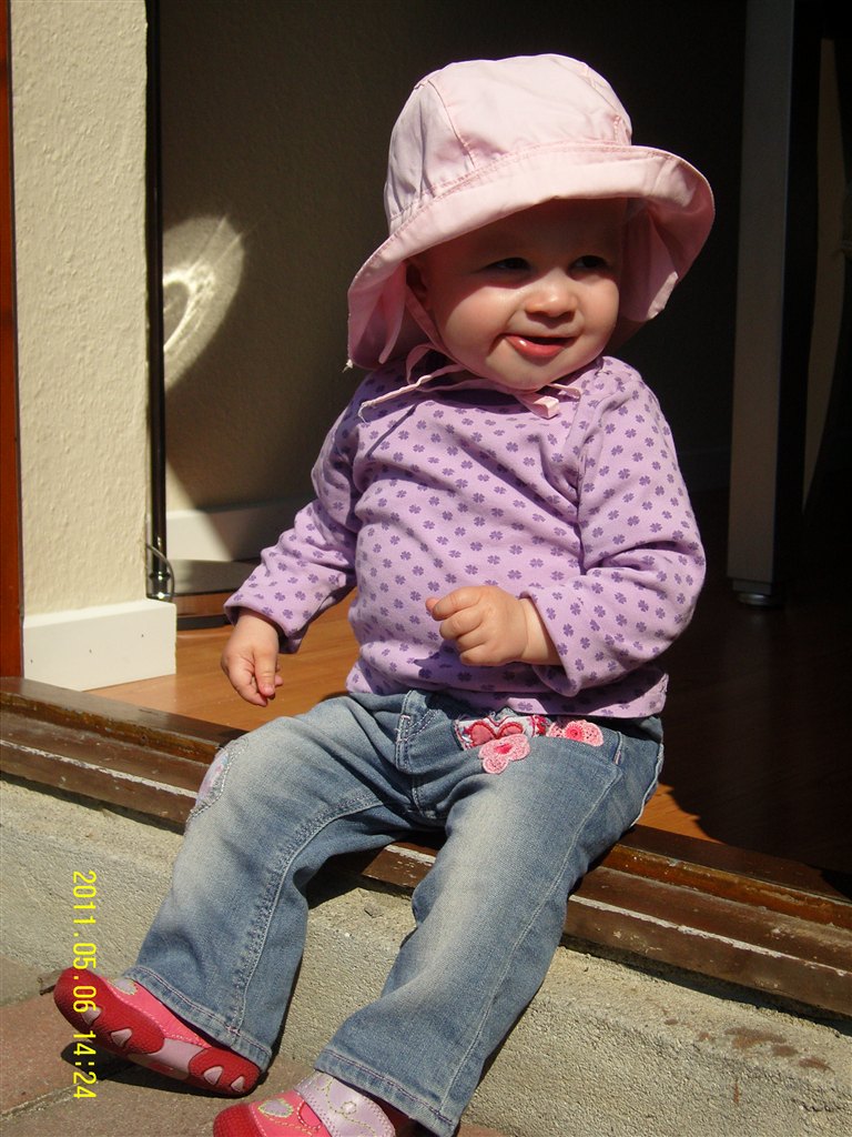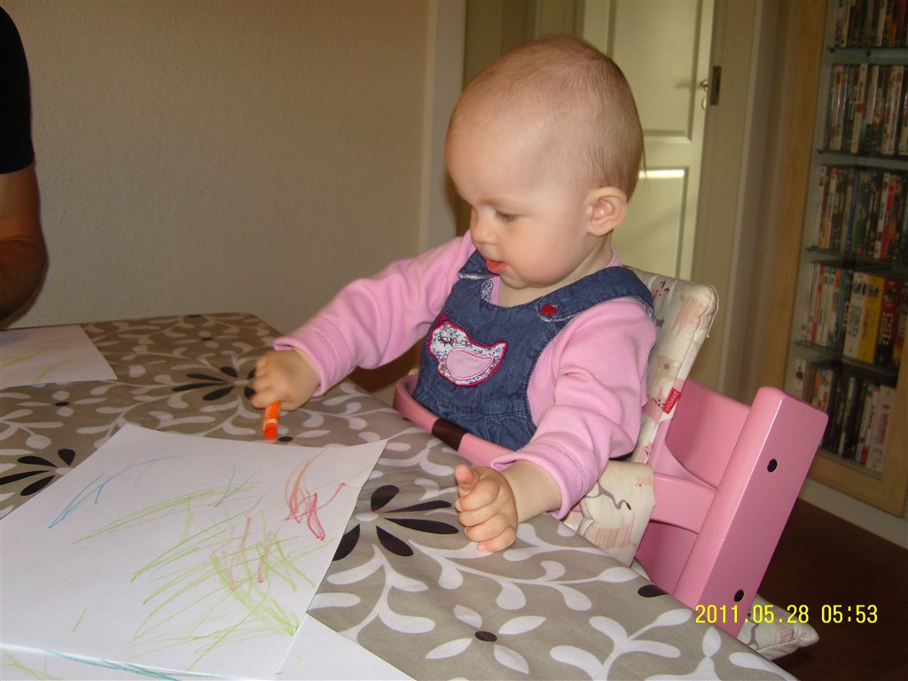 Hun er tæt på 19 mdr. og er igang med en vild hurtig udvikling i hendes sprog, hendes ordforråd er stort synes vi selv (lidt over 100 ord), men nu kommer der sørme også en masse sætninger fra hende: "ud og lege", "op og sidde", "hej mor/far", "vandet er koldt", "maden er varm", "godmorgen mor", Lærke ha´ frugt" osv.