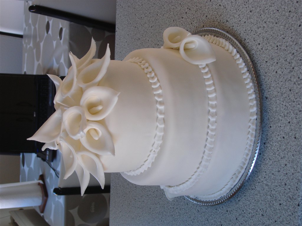 Jeg har fået lov til at lave en simpel bryllupskage til en veninde. Den skal på et stativ fra bageren, og hun vil have den hvid med cremefarvede roser på. Der skal være 4-5 på hver etage, og der er 5 etager.