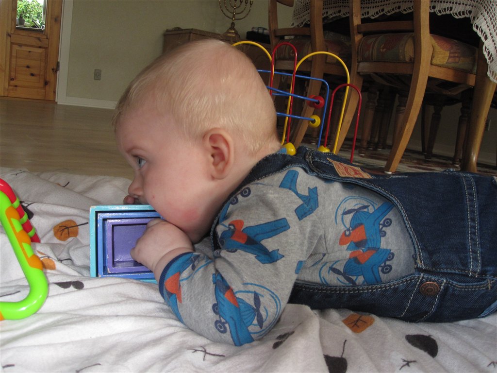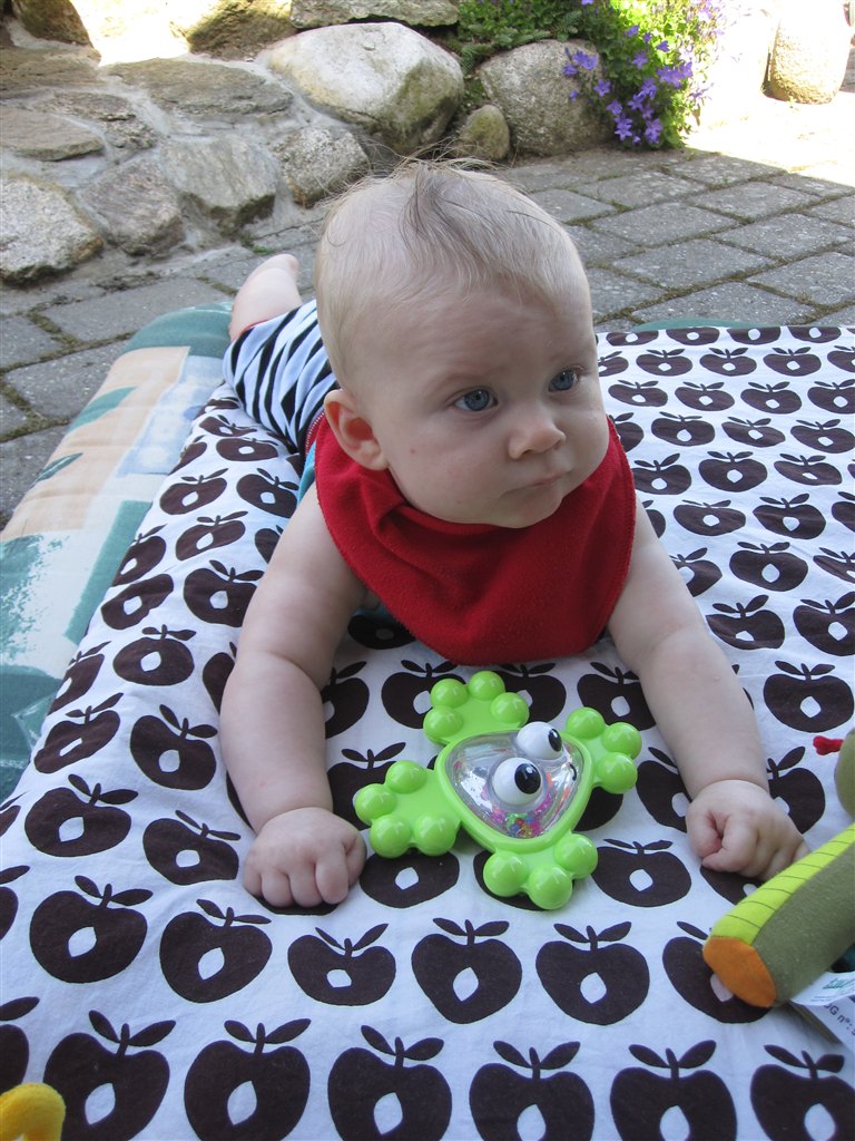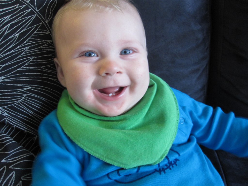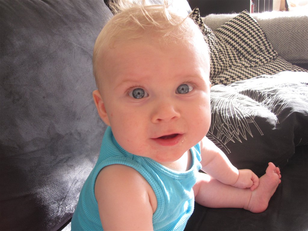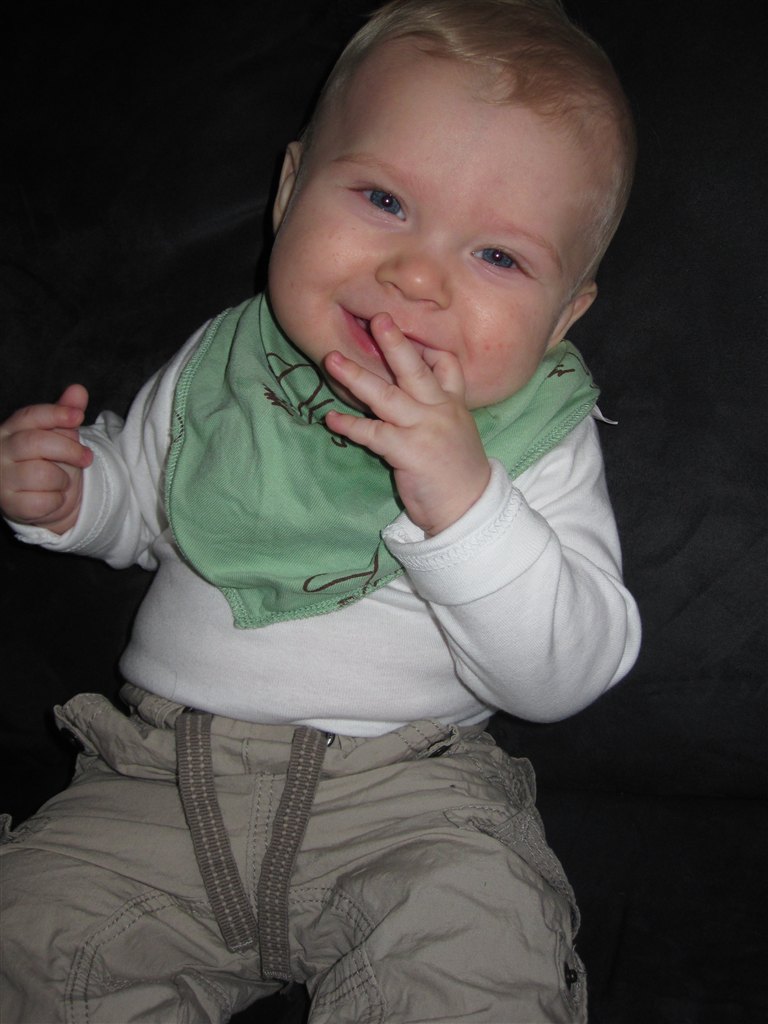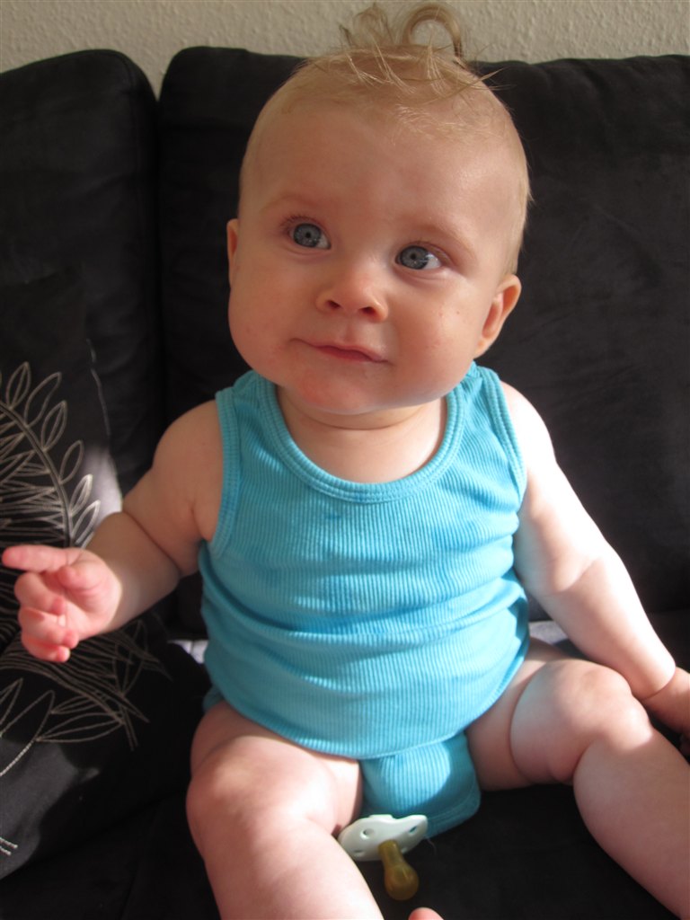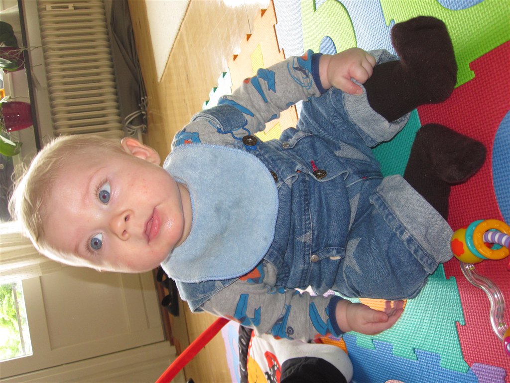 Han er så dygtig, og kan rigtig mange ting. Såsom at sidde selv, selv drikke af kop, stå op af ting hvor han kan holde fast og så er han så småt begyndt at kravle han kan iløbet af ingen tid nå ret meget omkring i stuen, så nu skal hjemmet vist snart børnesikres
