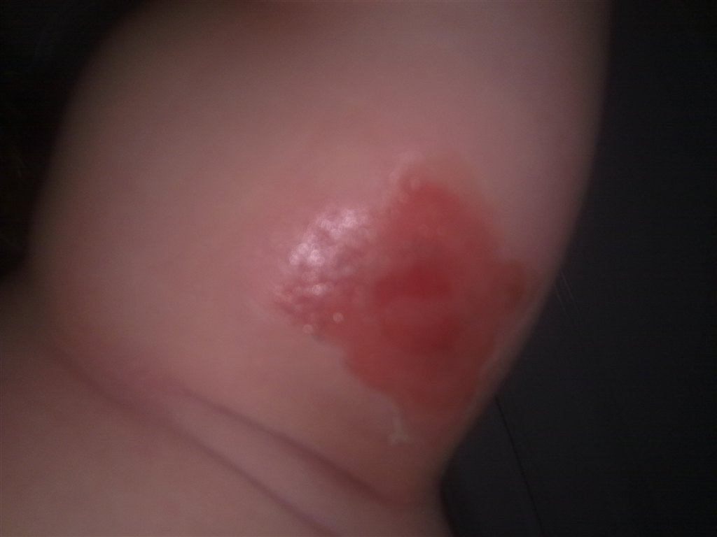 det startede som en vabel hvor huden var blevet flået af... sådan så det ud da jeg opdagede det.. troede hun havde fået en vabel derinde af at kravle med bare arme... men det bredte og bredte sig.. lægen sagde som sagt idag at det bare var et insektstik.. jeg har bare ikke lagt mærke til at hun er blevet stukket af noget derinde... så synes det er lidt mærkeligt.. men hun har meget ondt.. det lille pus