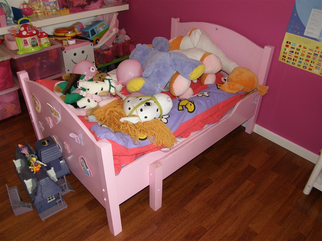 Lyserød og påbegyndt guldmaling på topkanterne. Små skumstickers påsat. En seng der kan vokse i takt med at barnet vokser. Medfølger madras til vist str, samt lameller og 2 ekstra madrasstykker til når sengen bliver trukket ud løbende. En rigtig fin seng, men vi skal flytte meget snart og får derfor ikke plads til den!