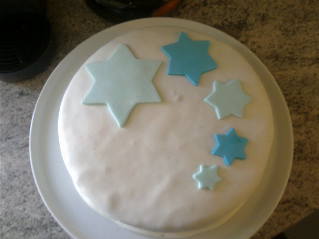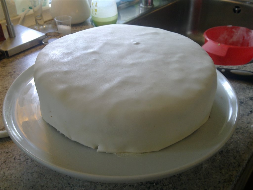 Skal lære at smøre den rigtigt op og ikke rulle fondanten for tynd ud, tror jeg... Som I kan se på billederne er den noget bulet og skæv...