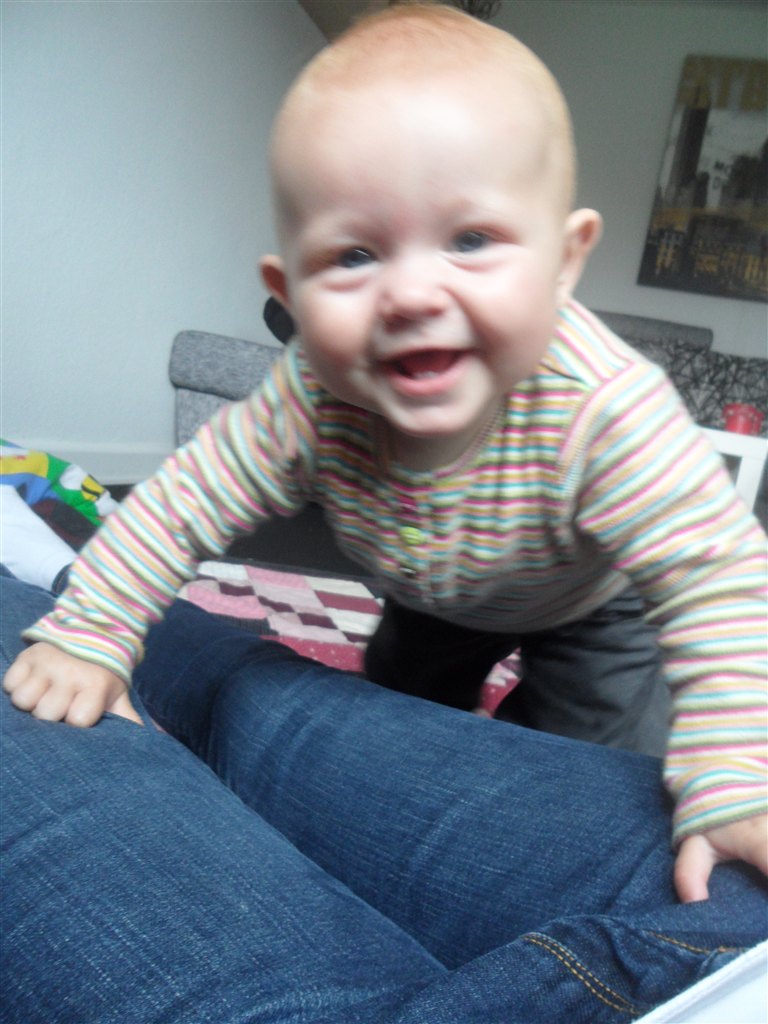 Tina&Daniel skriver: Her kom det fra den ene dag til den anden. Hun stod cirka stille 2 uger på det stadie hvor hun var oppe på alle fire - men bare rokkede frem og tilbage og faldt ned på maven igen. Men ja - det er jo det med at koordinere både begge ben og begge arme på een gang.