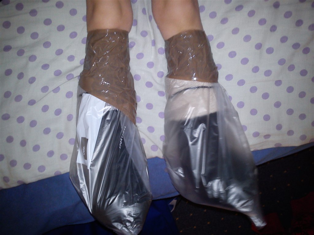 med begge fødder pakket ind i plastik og tape...