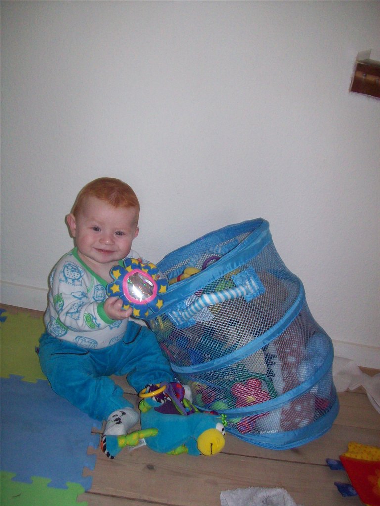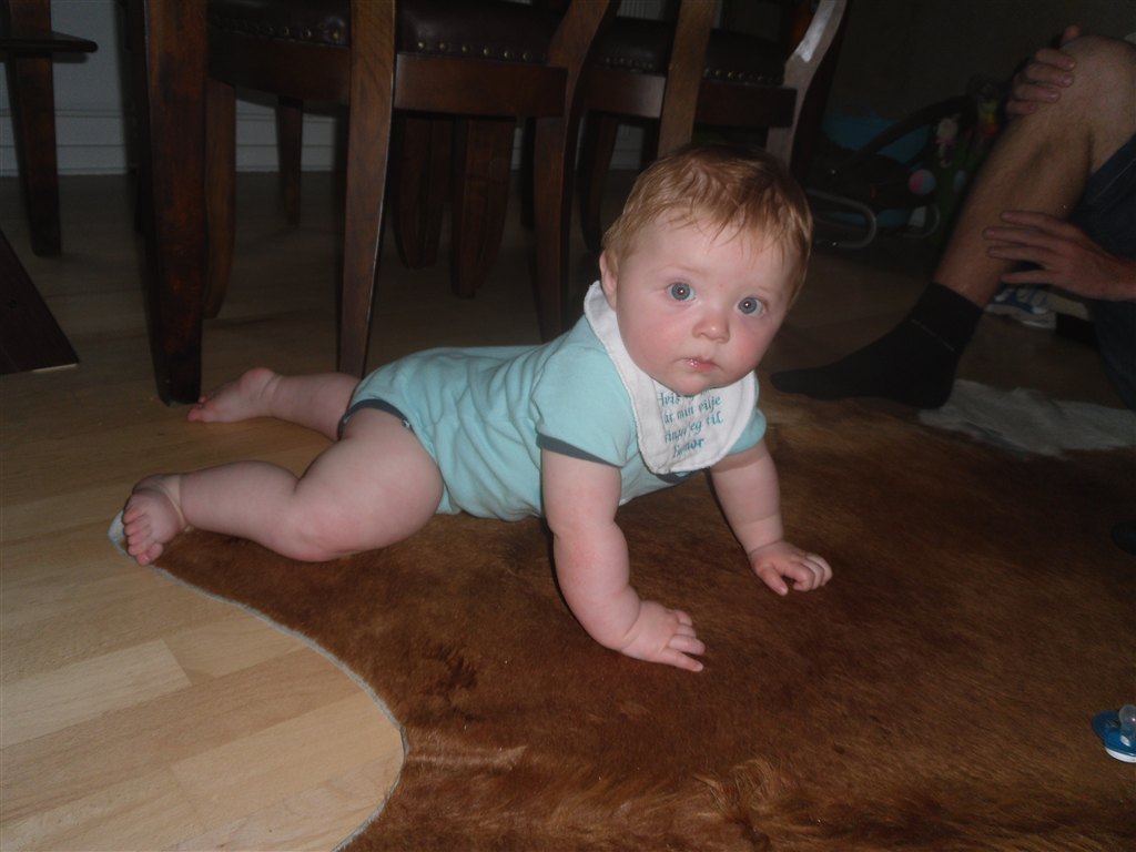 Hun sidder selv og kan møve sig lidt fremad på maven men træner ihærdigt at løfte numsen så hun rigtig kan komme afsted.