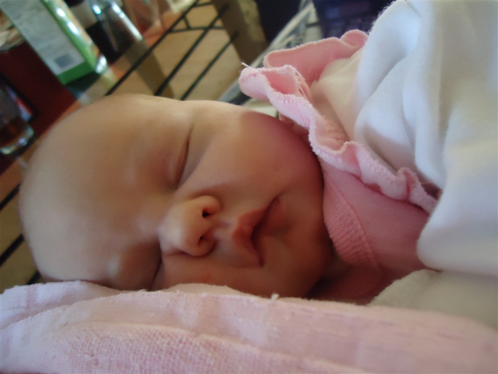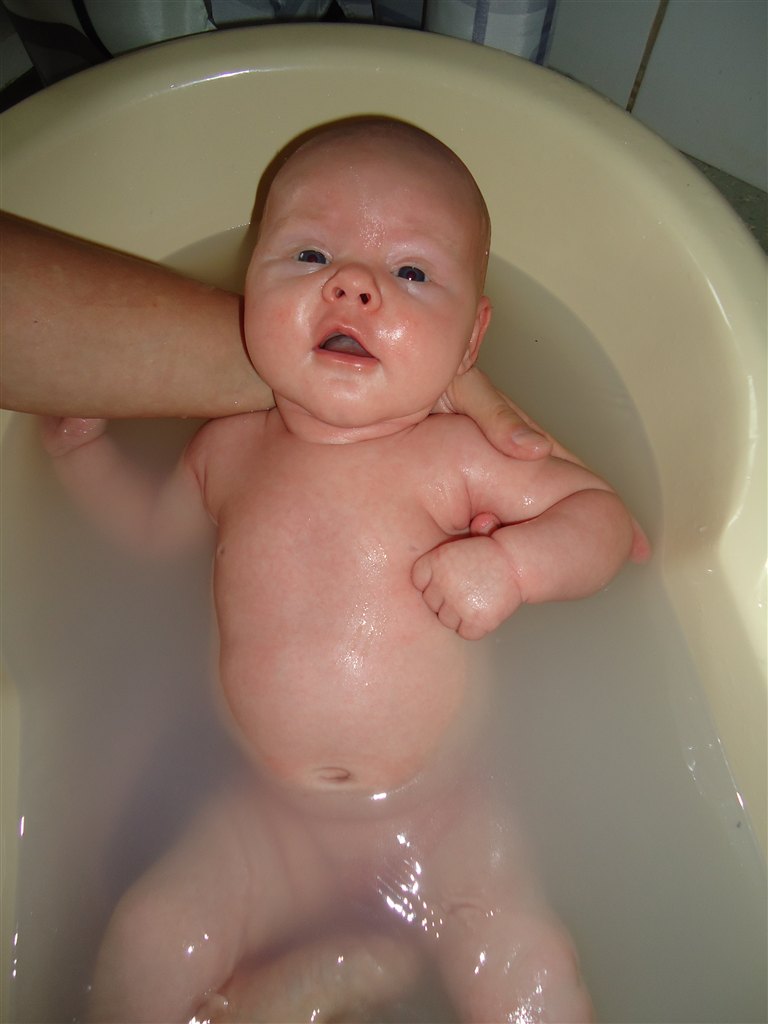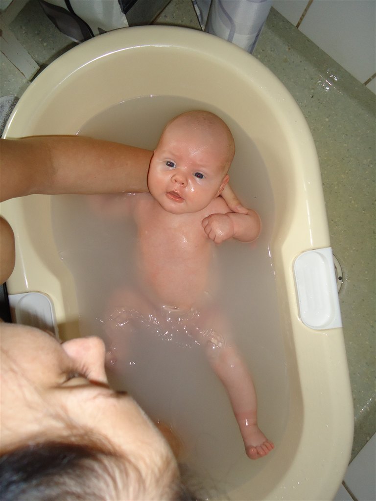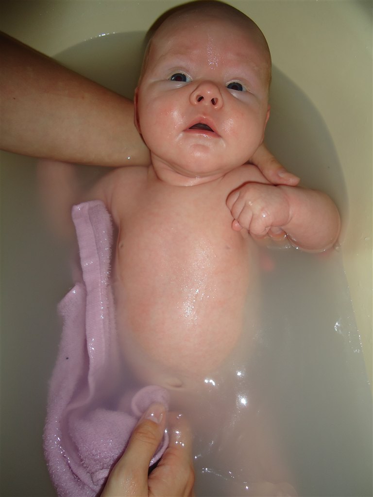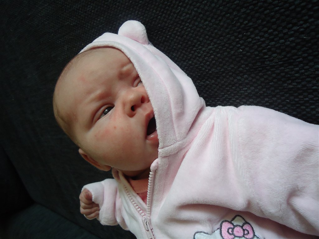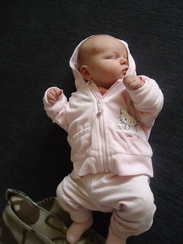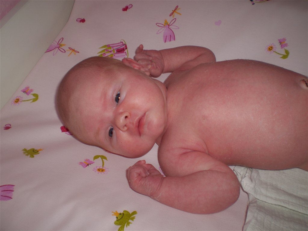 vægten ved fødslen var 3830 gram, tabte sig 200 gram, så på ti dage gik hun fra 3630 til 4240 gram, og nu vejer hun, en måned gammel, 5100 gram