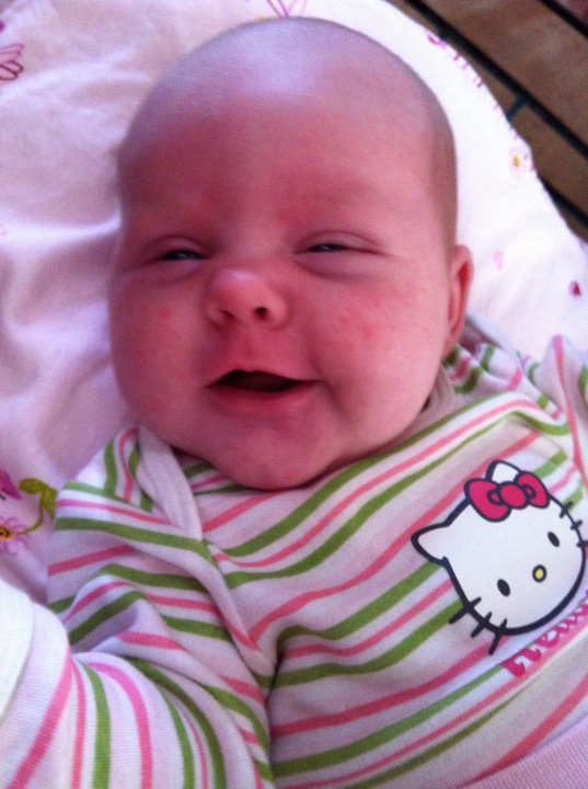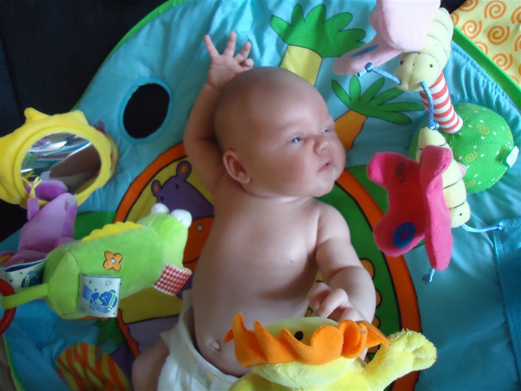 Hun er rigtig stærk i ryggen og nakken, løfter hovedet fint og hun holder øjenkontakt i lang tid, smiler over hele 5-øren og er så glad, er begyndt at pludre så småt og ligger og snakker