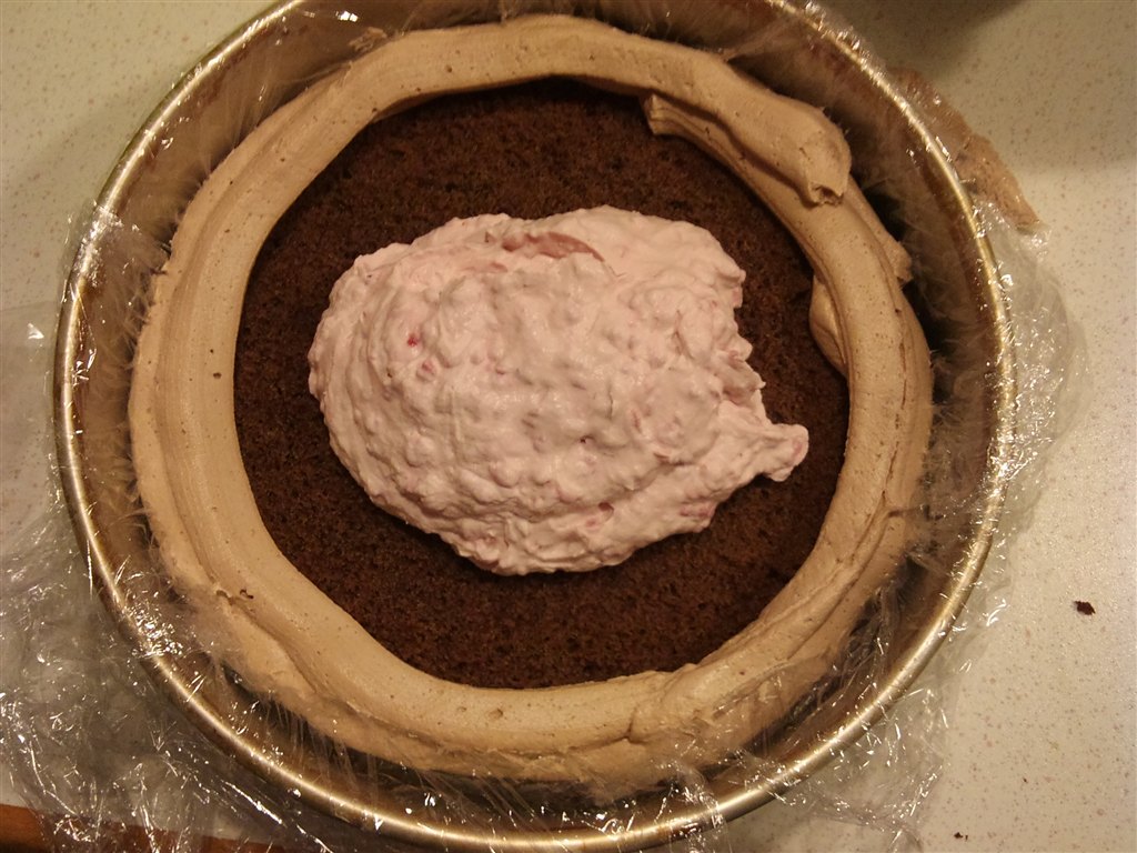 Du kan også undlade ringen og bare bygge den op. Jeg putter en kant af smørcremen rundt i kanten, det holder fyldet inde, og det gør det nemt at smøre op.