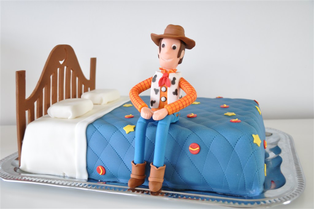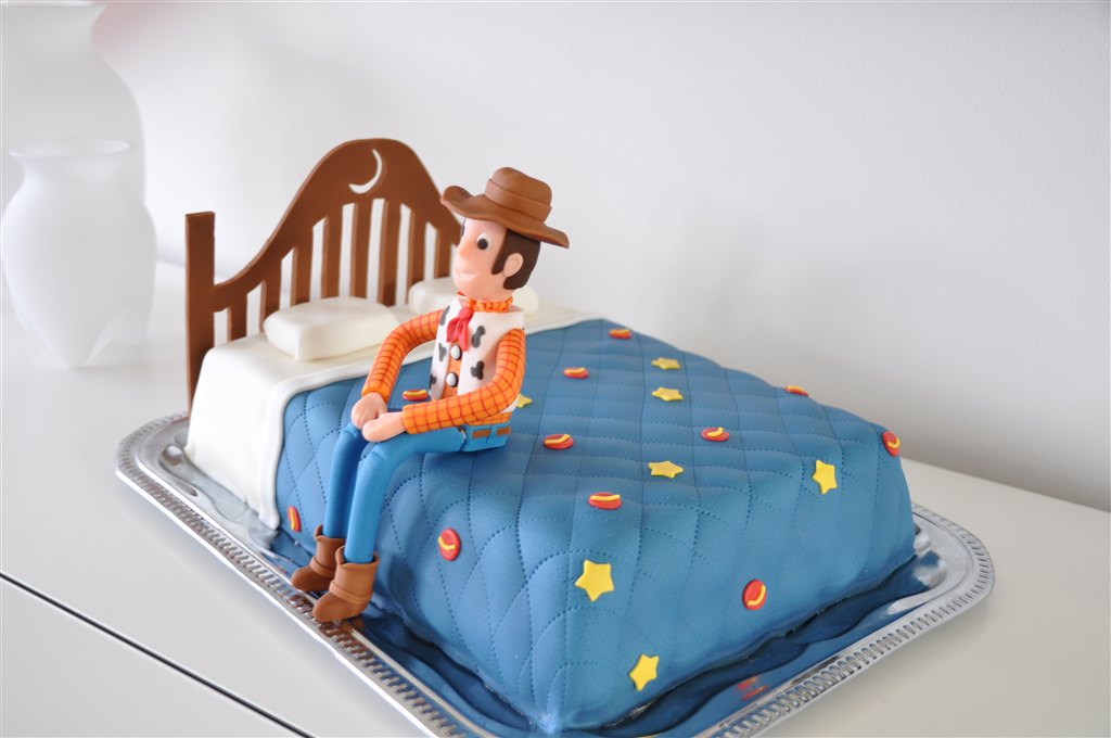 StineL skriver: Alexander fyldte 2 år i maj måned, og da et af de få ord han kan sige er "OY" ( Woody ) skulle han jo have en Toystory kage. Woody skulle have haft en fin sherifstjerne på, men den spiste AlexanderIndholdet er lyse bunde med lidt kardemomme, hvid chokolade creme med en smule karamelessens og brombær, som har ligget i blød i Kahlua. Mums