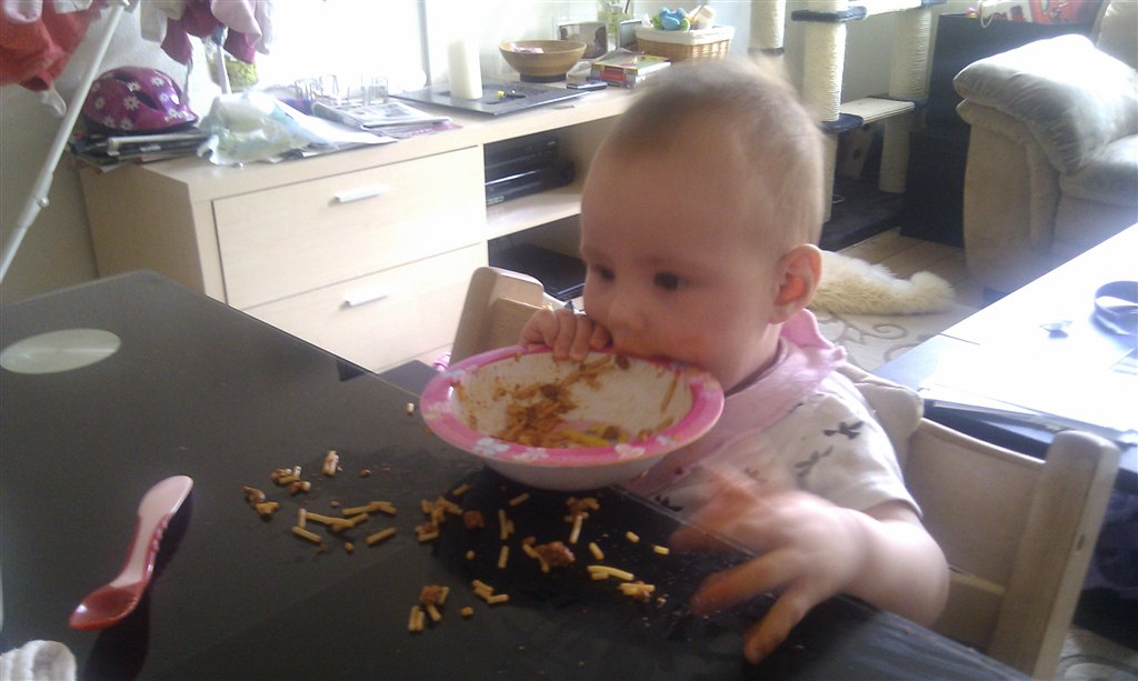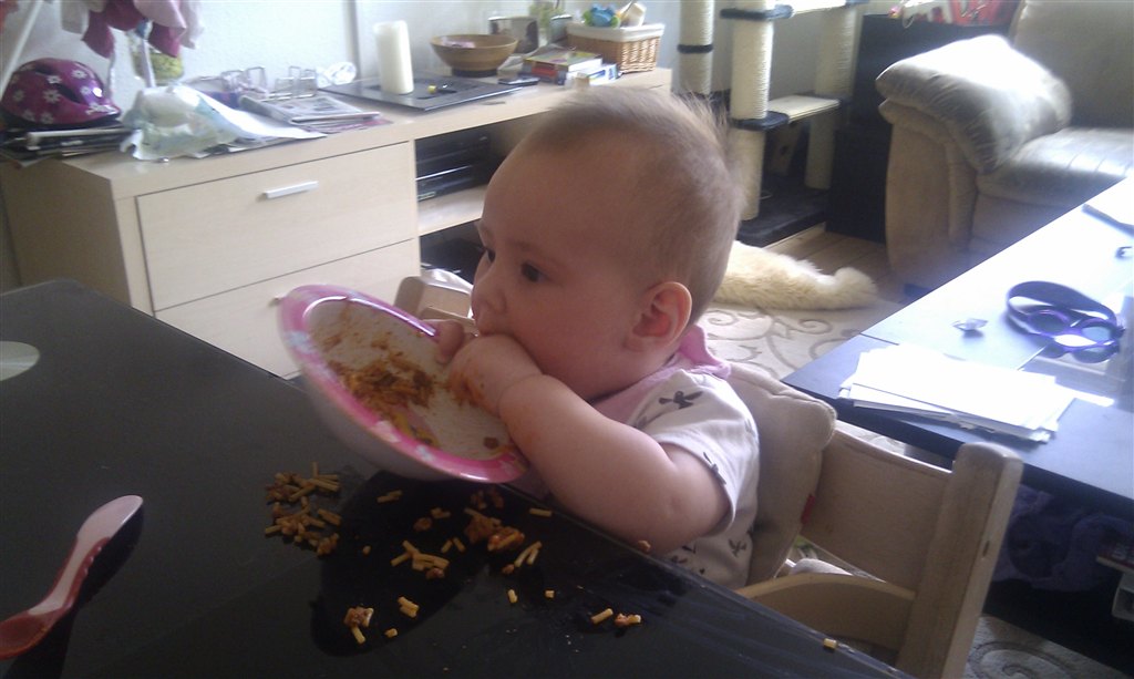 Han vil med glæde sidde og mose spaghetti med kødsovs osv. med hænderne og også meget gerne smide det på gulvet, eller tømme tallerkenen på bordet, køre det rundt og så ned på gulvet sammen med tallerkenen. Men han kan slet ikke finde ud af at komme det ind i munden, og da han heller ikke gider at få noget på ske eller med fingerne fra mig, så får han jo ikke ret meget indenbords.