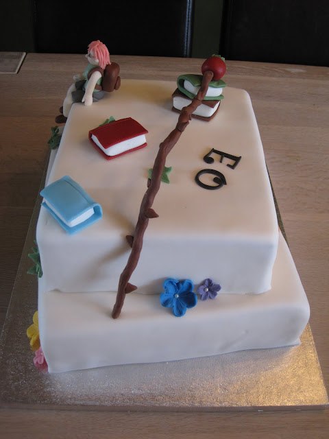En kage til min mands dejlige kollega der i dag fejrer at hun har været skolelære i 25 år. På kagen er nogle symboler der betyder meget for hende. En tornet gren med et hybenbær og "E.O" har hun tattoveret på sin fod. Hvad det helt betyder kan jeg ikke huske men jeg ved at hun bliver glad for at det er på hendes kage:-)Hun bruger meget tid på at vandre derfor sidder hun i sine vandreshorts og med rygsæk på. Bøgerne er selvfølgelig fordi hun er lærer:-)Indeholder:Marcipanbunde, rabarbermousse og tobleronecreme. Smurt op med PSC og pyntet med fondant.60 kuv