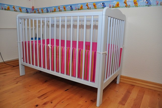 Min svigermor har været så sød at sy en til Antons seng med velcro-bånd der sættes fast om tremmerne, så den sidder helt spændt ud og er meget svær at få af - det er ikke lykkedes Anton endnu og han har hevet MEGET i den