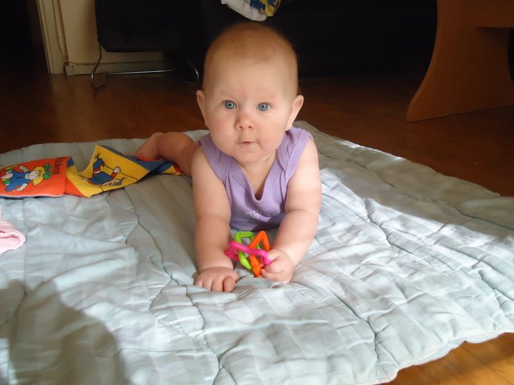 Isabella kan nu sidde selv, møver sig frem (hun har ikke lært at numsen skal med op). Rugbrød har vi haft lidt problemer med, men har netop holdt en lille pause - for hendes 3. bisse i undermunden har drillet hende