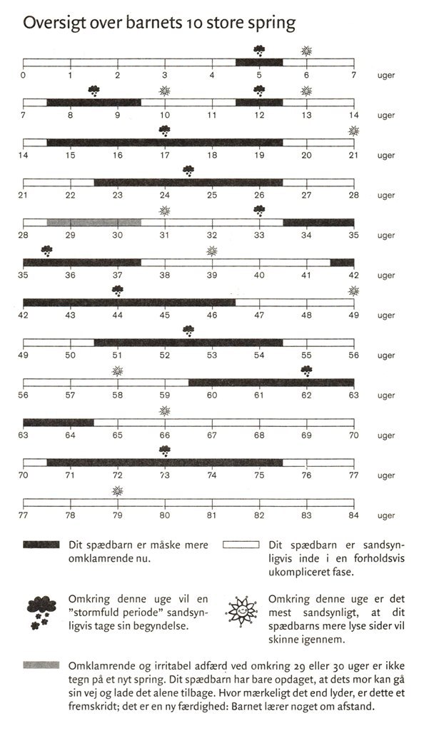 I løbet af det første år i et barns liv, findes der 8 tigerspring, de kan også kaldes udviklingsspring. Det er såmænd bare nogle stadier i dit barns udvikling, som det gennemgår. De kommer i forskellige grader fra barn til barn, feks er nogle babyer meget sensitive og reagerer meget på springene, eller også kan du ikke mærke noget på din baby overhovedet. Springene kommer i uge 5, 8, 12, 19, 26, 37, 46 og 55. I bogen De vidunderlige uger, kan du læse hvad der sker i de forskelige uger.